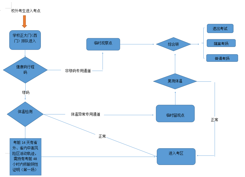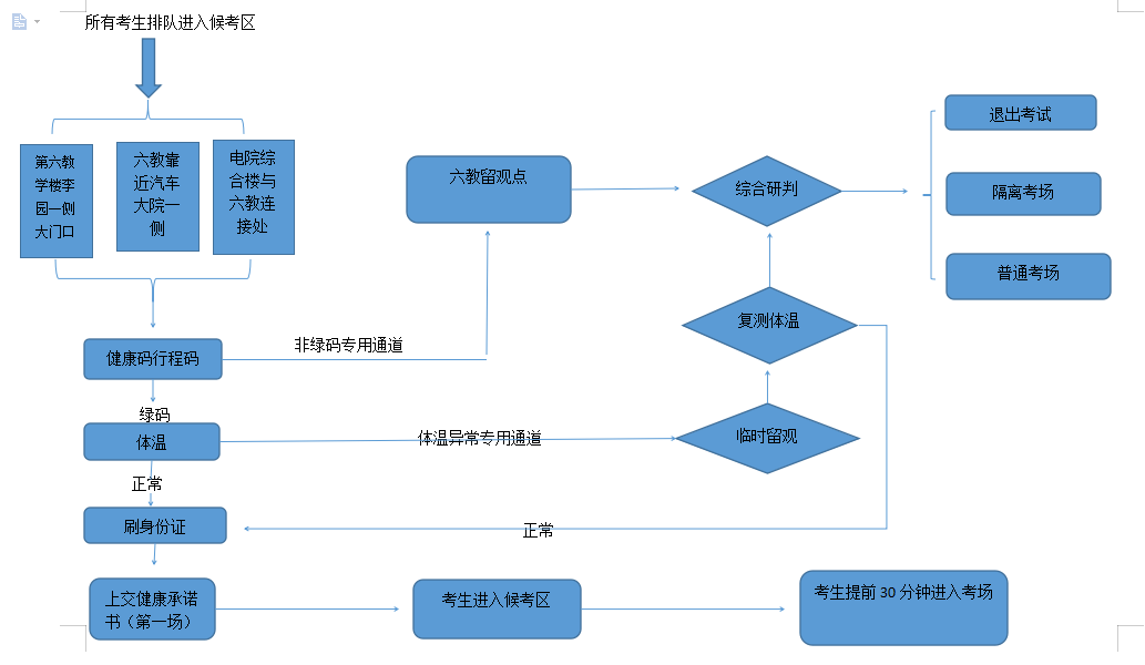 2.考生进入考场健康状况核查。考生进去考点后,按照指示标志前往考场(第六教学楼),考点在第六教学楼考场外围设立三处体温测量和身份证验证“入场验证”检查点,分别在第六教学楼李园餐厅一侧大门口、第六教学楼与电院综合楼一楼通道、第六教学楼靠近汽车大院一侧侧门位置。考试开始前1小时考生可在三处检查点分别排队,所有考生凭本人《2022年湖北省研考考生健康考试承诺书》、“健康码”绿码、“行程卡”绿卡、有效居民身份证、准考证、测量体温,并在考生准考证当场科目处加盖“已验”公章后进入候考区等候,预备铃响后已在候考区的考生可直接进入考场。