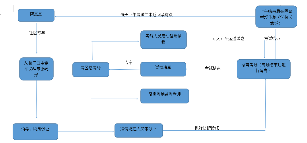 3.异常情况考生进入考场。集中隔离的考生,经疾控部门综合研判,由当地疾控部门协调专用车辆将考生从隔离场所转运至原考点隔离考场考试,考试结束后再转运回隔离场所。居家隔离的考生向所在社区申请,按照社区要求,自行前往或由社区人员陪同前往原考点隔离考场考试,自行前往不得乘坐公共交通。