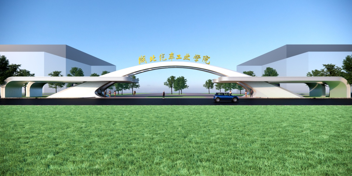 本大门方案设计的造型以”汽车”为原型,通过抽象变形后,大门整体意象有二,其一以汽车侧面造型为原型,该意向“突出地表达了学校鲜明的学科特色、办学特色;代表了学校围绕汽车产业链,致力于培养汽车行业卓越工程师的远大理想和宏伟目标。其二如李白诗句中的两岸夹明镜,双桥落彩虹,宛如两山之间架起的拱桥,两者合在一起的寓意为湖北汽车工业学院以开放的胸怀,接纳学子,并将为各位学子架起一座通向成功的虹桥。