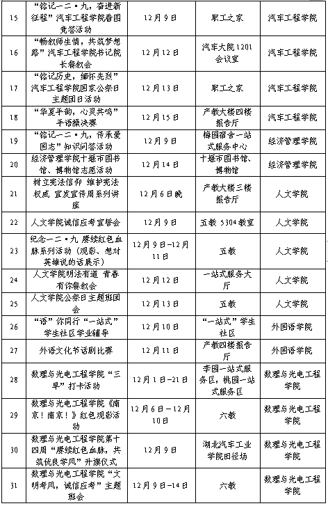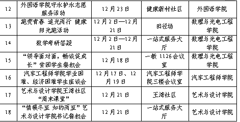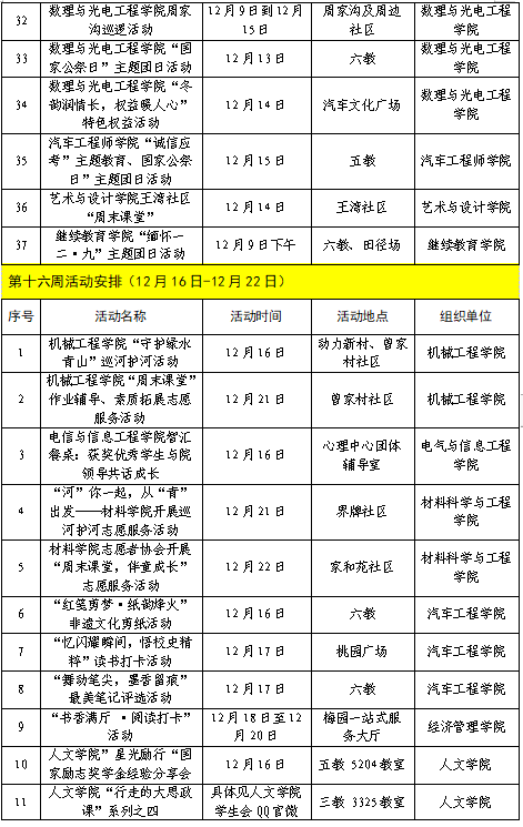 “第二课堂”主要校园文化活动安排表(第十五周至十六周,12月9日--12月22日)