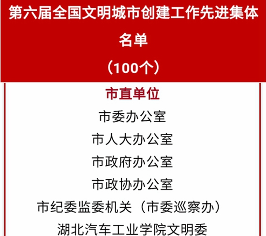 本网讯(文/杜鹏)2月26日上午,十堰市召开精神文明建设表彰暨第七届全国文明城市创建动员大会,湖北汽车工业学院被授予“第六届全国文明城市创建工作先进集体”荣誉称号,校党委副书记杨立志代表学校出席大会。