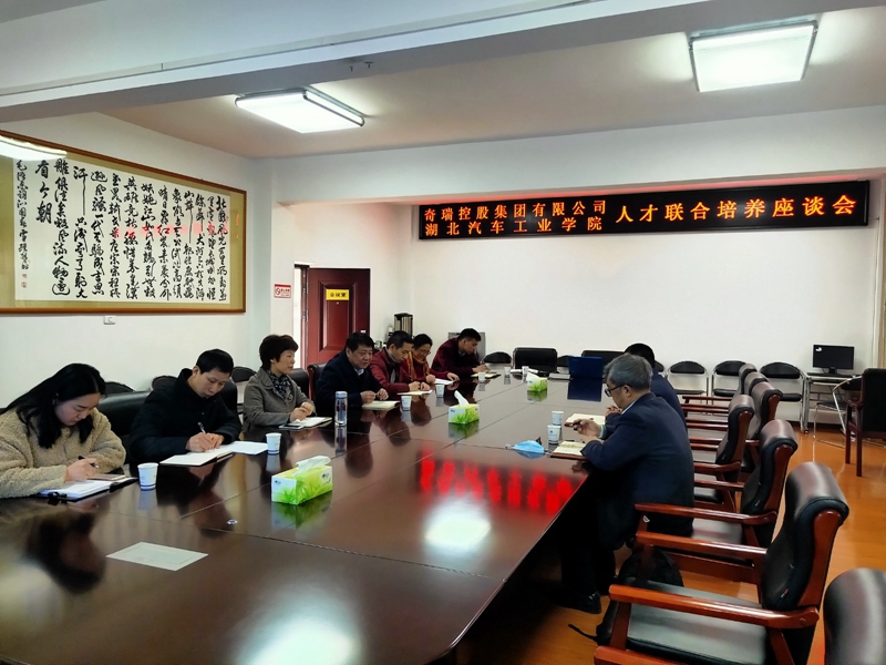 本网讯(文/徐正凯)3月12日上午,奇瑞控股集团有限公司-湖北汽车工业学院人才联合培养座谈会在学校行政楼三楼会议室召开。奇瑞控股集团奇瑞大学执行校长、奇瑞汽车股份有限公司人力资源部副部长毕全国、奇瑞大学资深顾问周捷;湖北汽车工业学院党委书记程红兵、教务处处长张红霞、副处长刘荣、机械学院副院长周学良、汽车工程学院院长助理周红妮、合作发展处办公室主任叶珍、部分二级学院教师代表参会,会议由张红霞主持。