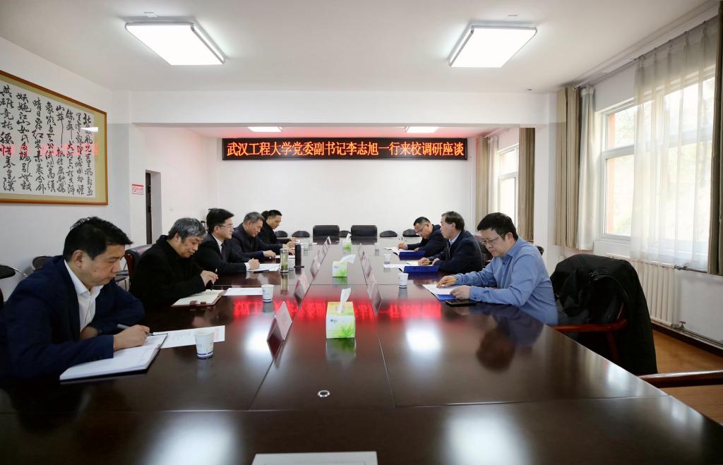 本网讯(文 朱志斌/图 广娟)3月15日下午, 武汉工程大学党委副书记李志旭、宣传部部长路海华、学工部部长、学生处处长吕容涛一行来我校调研,学校党委副书记、校长张文学,党委副书记杨立志、副校长简炜陪同调研。