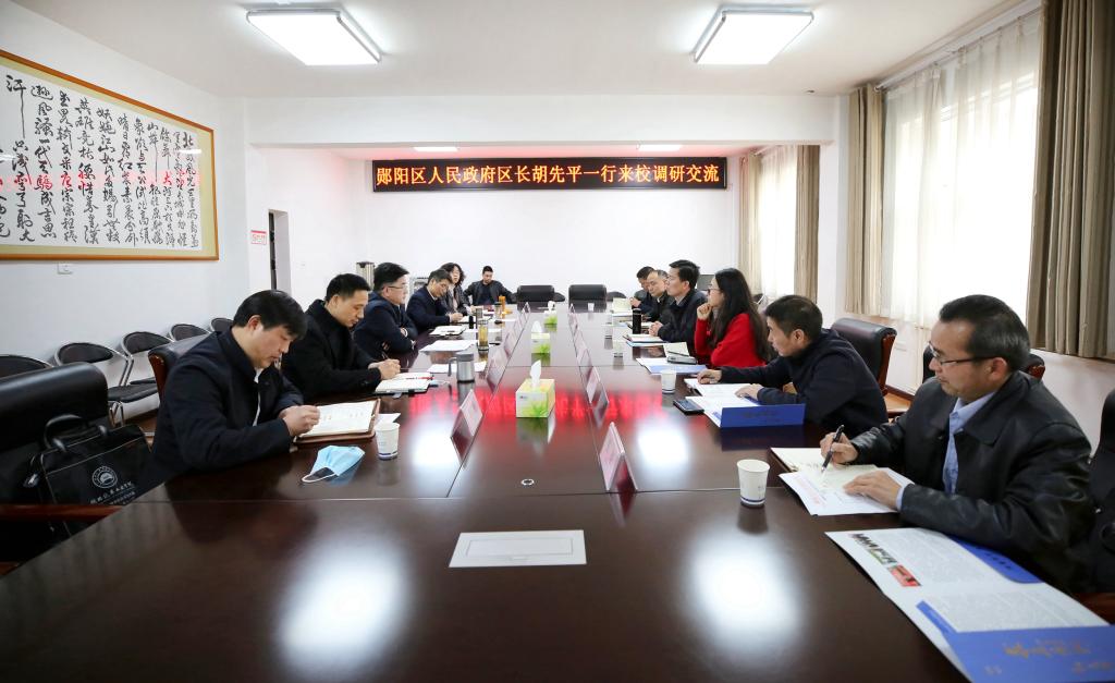 本网讯(文 朱志斌/图 广娟)3月25日下午,郧阳区委副书记、区长胡先平、副区长望甜、区政府党组成员黄波、柳陂镇党委书记卢贵昌、区委办副主任潘朝东、区政府办副主任张瑛一行莅临我校调研。学校党委副书记、校长张文学、副校长张友兵热情接待并出席了座谈会,学校校办(党办)主任王文山、发展规划处处长黄进涛、科技学院院长李正桥、分党委书记米欣欣参加了座谈会。