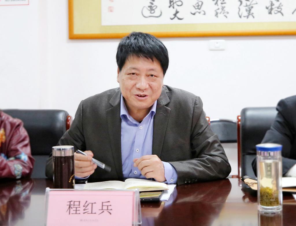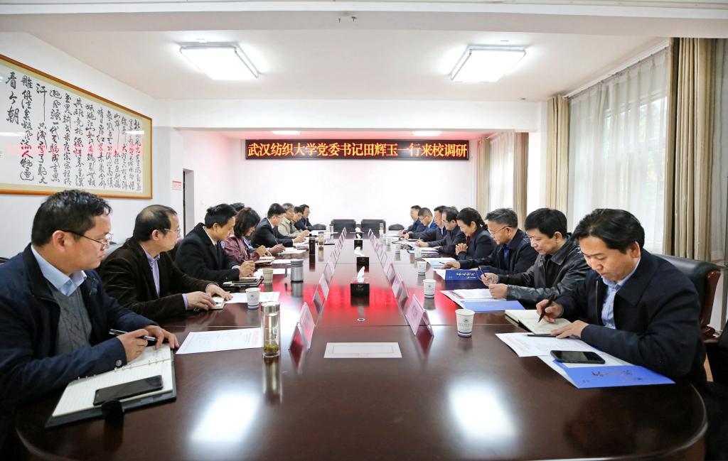 本网讯(文、图/广娟)人间芳菲四月天,谷雨时节迎客来。4月21日下午,武汉纺织大学党委书记田辉玉,副校长黄运平,纪委书记、监察专员程碧海率队来校调研交流。我校党委书记程红兵,党委副书记、校长张文学,纪委书记、监察专员林雪荣,副校长简炜热情接待了田书记一行。