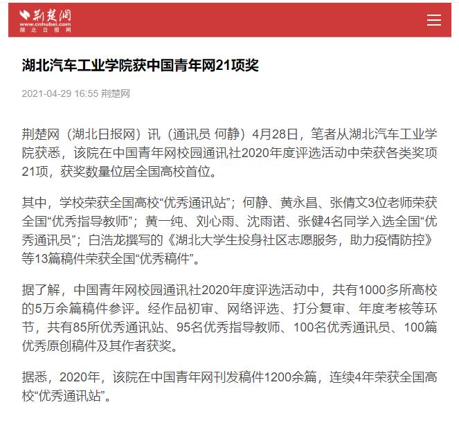 【荆楚网(湖北日报网)】湖北汽车工业学院获中国青年网21项奖