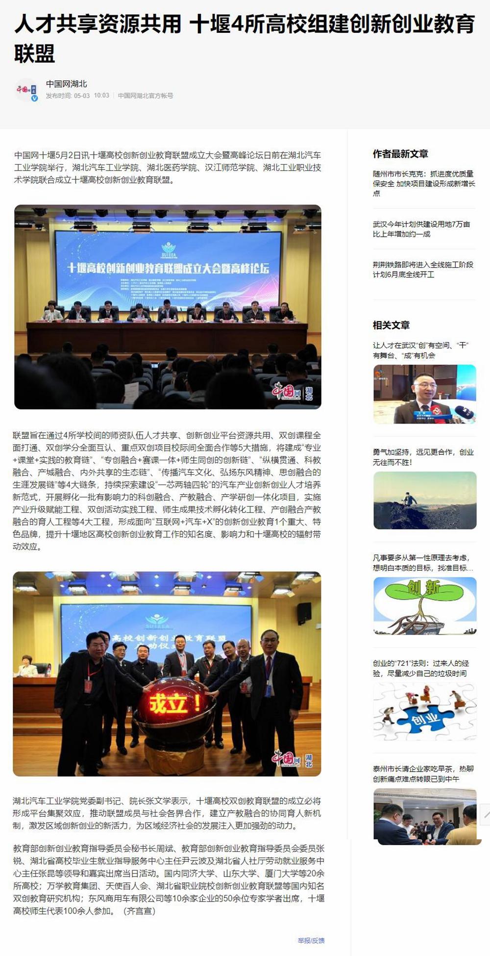 【中国网】人才共享资源共用 十堰4所高校组建创新创业教育联盟