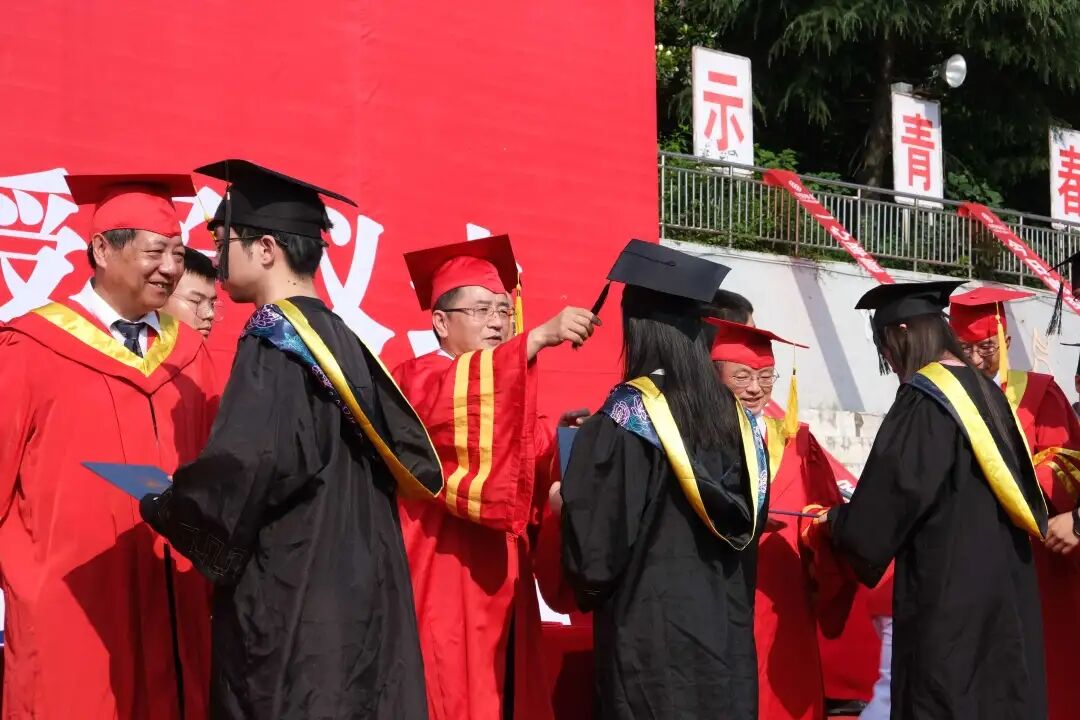 在学位授予环节中,张友兵副校长宣读了2021年学士学位授予决定,接着毕生们身着学位服依次走上主席台,双手接过导师们颁发的学位证书,并接受导师们一一拨流苏授予学位,在闪光灯下留下一个个珍贵的镜头。