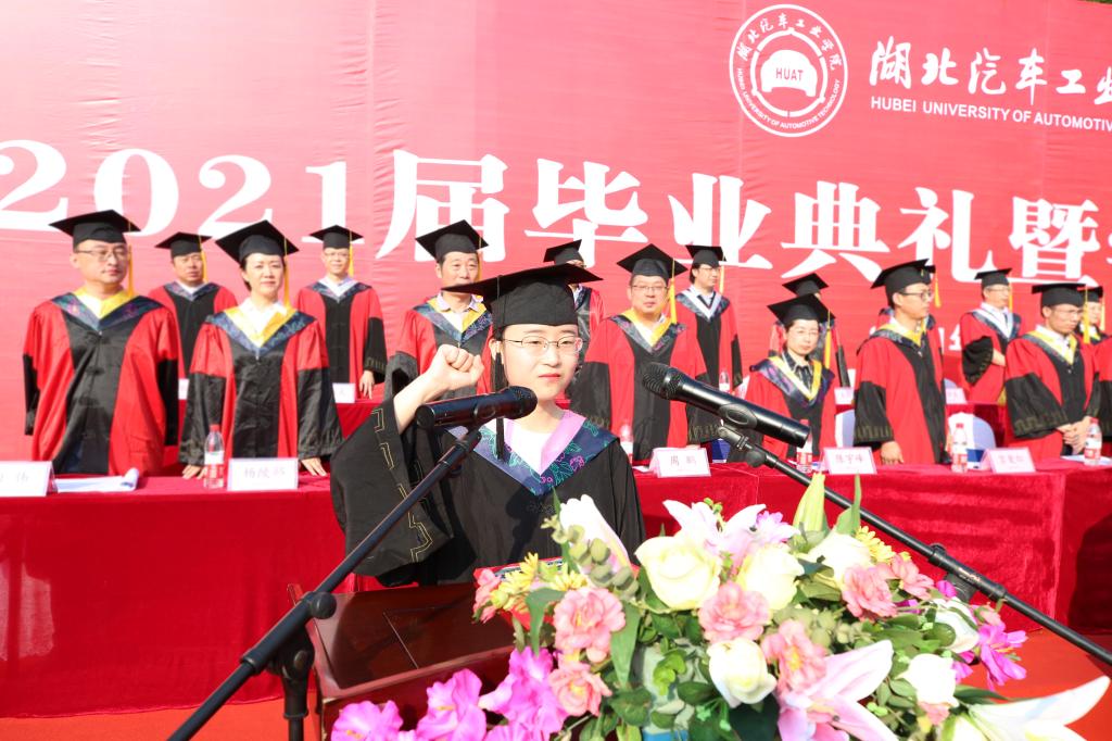 机械工程学院2021届本科毕业生陈烨作为毕业生代表发言。他说汽院,教会他在社会实践中学习;汽院,加深了他的家国情怀;汽院,坚定他天道酬勤的信念。汽院学子不仅是“造车人”,还是时代的造梦者,只要始终坚信,满怀希望,就会所向披靡!他代表毕业生感谢母校的培养,愿母校光辉历程更辉煌,愿各位老师身体健康,工作顺利,愿各位同学前程似锦!并呼喊出“奔跑吧,汽院人!”的口号。