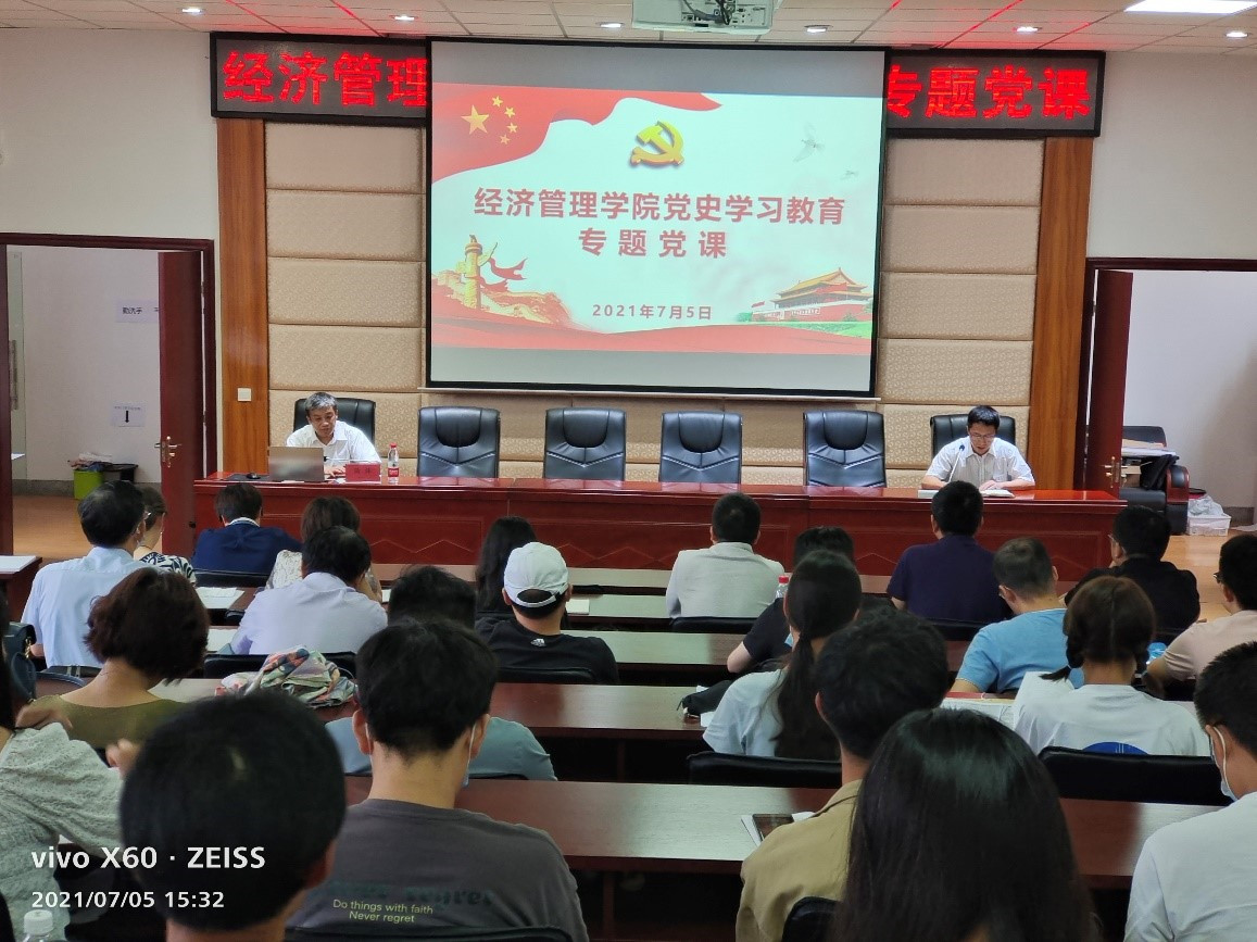 本网讯(文/董海燕)7月5日下午,按照上级和学校关于党史学习教育要求,副校长简炜在第三教学楼3425会议室为经济管理学院全体师生党员讲授专题党课。会议由经济管理学院分党委书记杨长春主持。