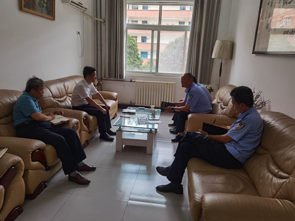 本网讯(文/赵伟 图/陈雪刚)7月20日上午,东岳分局消防二中队中队长李光宝一行4人来学校进行消防安全检查,并就做好学校消防安全工作与校长张文学、副校长简炜进行了交流。