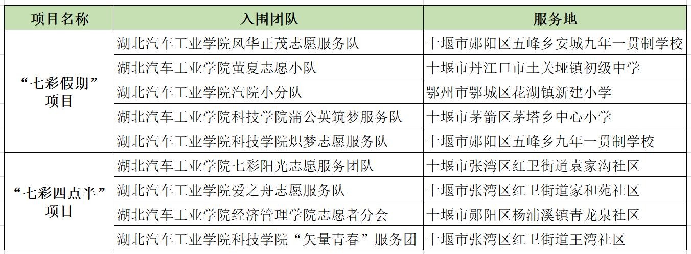本网讯(文/何静)近日,中央文明办三局、团中央青年志愿者行动指导中心、中国青年志愿者协会秘书处公布了2021年“圆梦工程”助力乡村学校少年宫“七彩假期”志愿服务团队和青年志愿者服务社区行动“七彩四点半”志愿服务项目示范团队名单,我校共有9支团队入围。入围团队将获得团中央提供的志愿服务大礼包和专项资金支持。