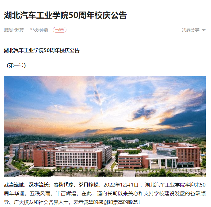 【一点资讯】湖北汽车工业学院50周年校庆公告