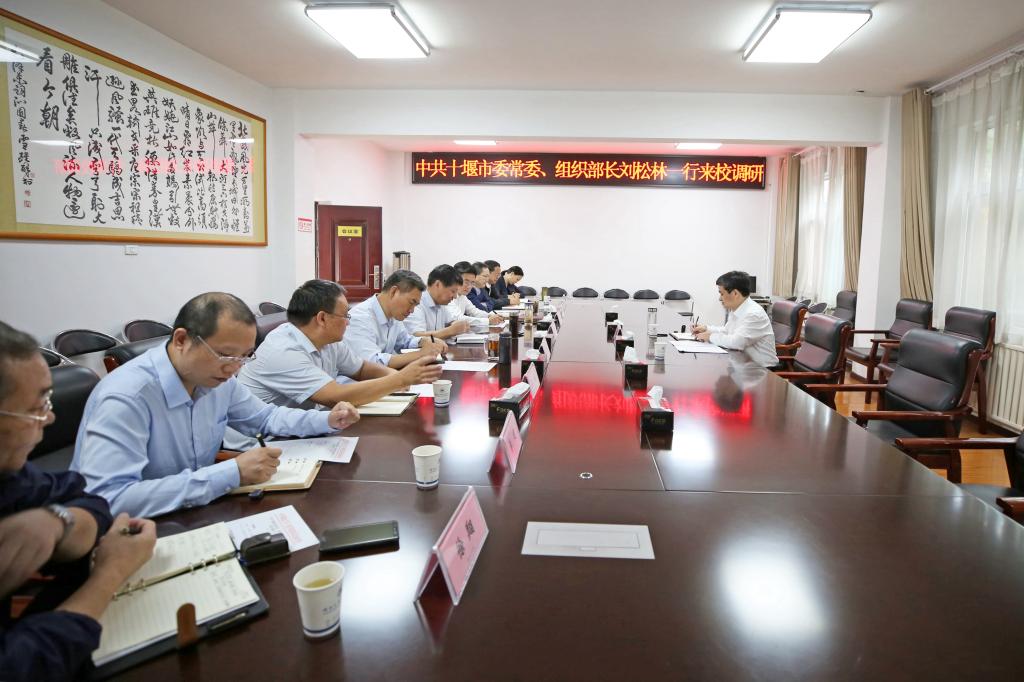 本网讯(文/图 广娟)9月28日下午,十堰市委组织部部长刘松林来校调研,我校党委书记程红兵,校长张文学,副书记杨立志、李涛及相关职能部门负责人陪同调研。