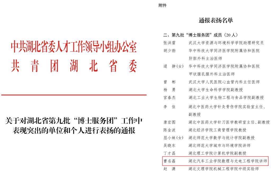 本网讯(文/张传坤)9月23日,湖北省委组织部、共青团湖北省委在武汉召开了湖北省“博士服务团”第九批总结暨第十批动员培训会,并对第九批“博士服务团”工作中表现突出的单位和个人进行了通报表扬。我校曹名磊博士因“博士服务团”工作出色,位列通报表扬名单之中。据悉,在参加第九批“博士服务团”的100名博士中,仅有20人获此殊荣。