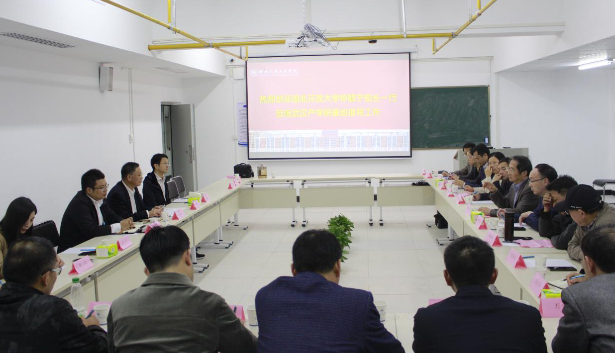 本网讯(文/图 干枘鑫)10月15日下午,湖北开放大学校长钟毓宁一行20人赴我校武汉产学研基地考察调研工作。受张文学校长委托,武汉产学研基地分党委书记、负责人郭都玺主持交流活动。