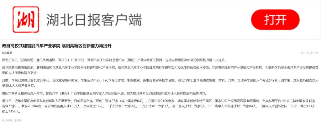 【湖北日报】政府高校共建智能汽车产业学院 襄阳高新区创新能力再提升