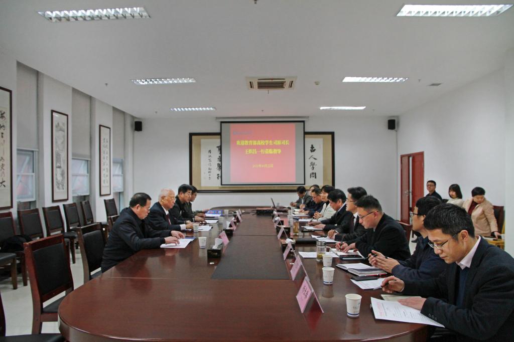 程红兵简略介绍了学校发展历程、办学特色、办学质量和师资队伍等情况。张红霞重点介绍了学校在人才培养中学生实习实训的情况。王炽昌在交流讲话中高度评价了学校建设发展的成绩,还针对学校的发展语重心长地提出了指导性的意见与建议。他指出,学校要进一步转变观念,正确领会新形势新任务,全面贯彻国家培养拔尖创新人才的要求;要进一步明确学校的办学定位与职责,做大做强特色优势,跟上时代步伐,做有远见的高校管理者;要进一步落实好立德树人这一根本任务,全员全程全方位育人,助力学生的全面发展。张文学在主持中表示学校定会顺应时代大势,紧抓发展机遇,走好高质量特色发展之路,全力为国家的人才培养、科技创新做出汽院贡献。