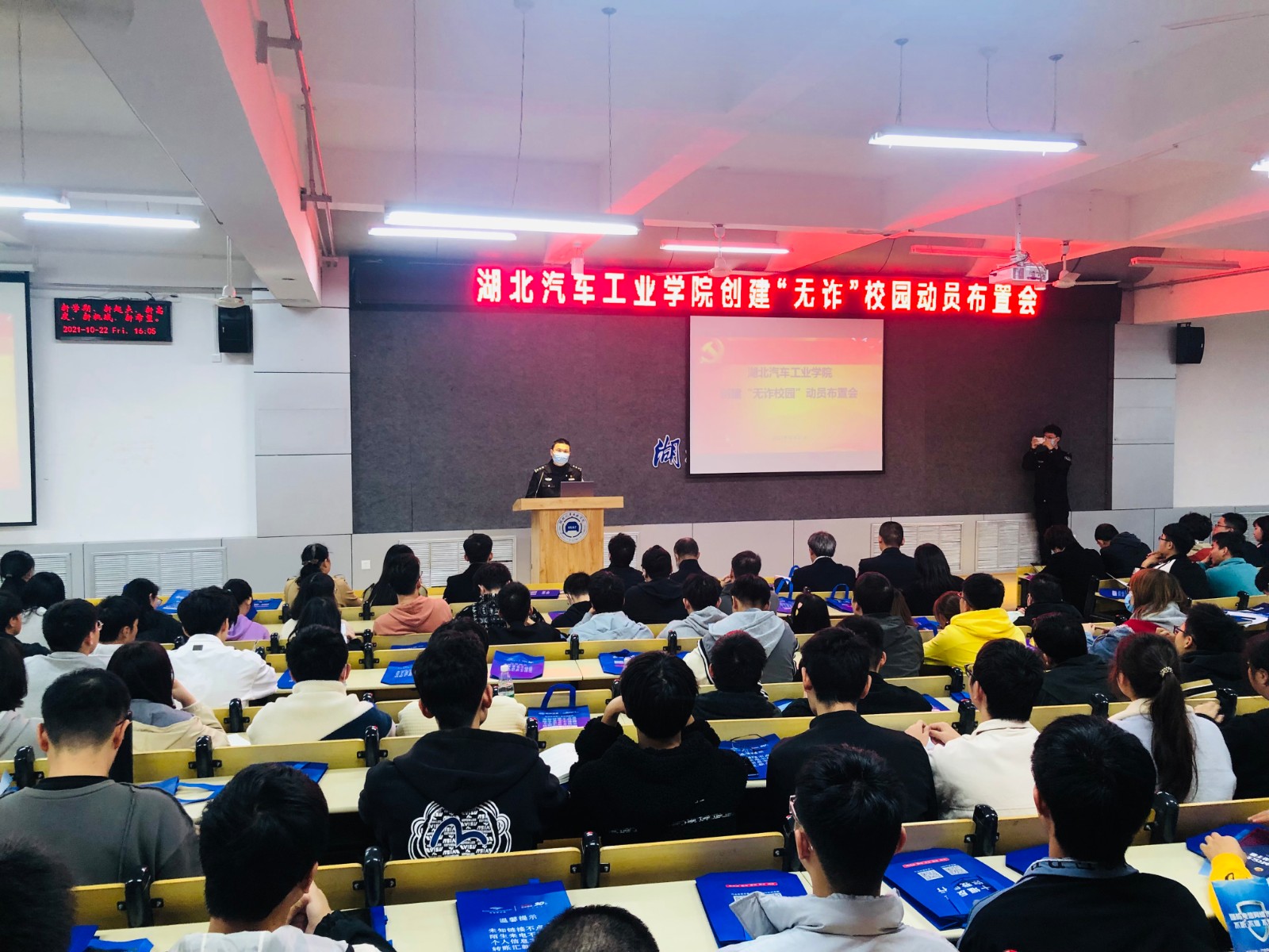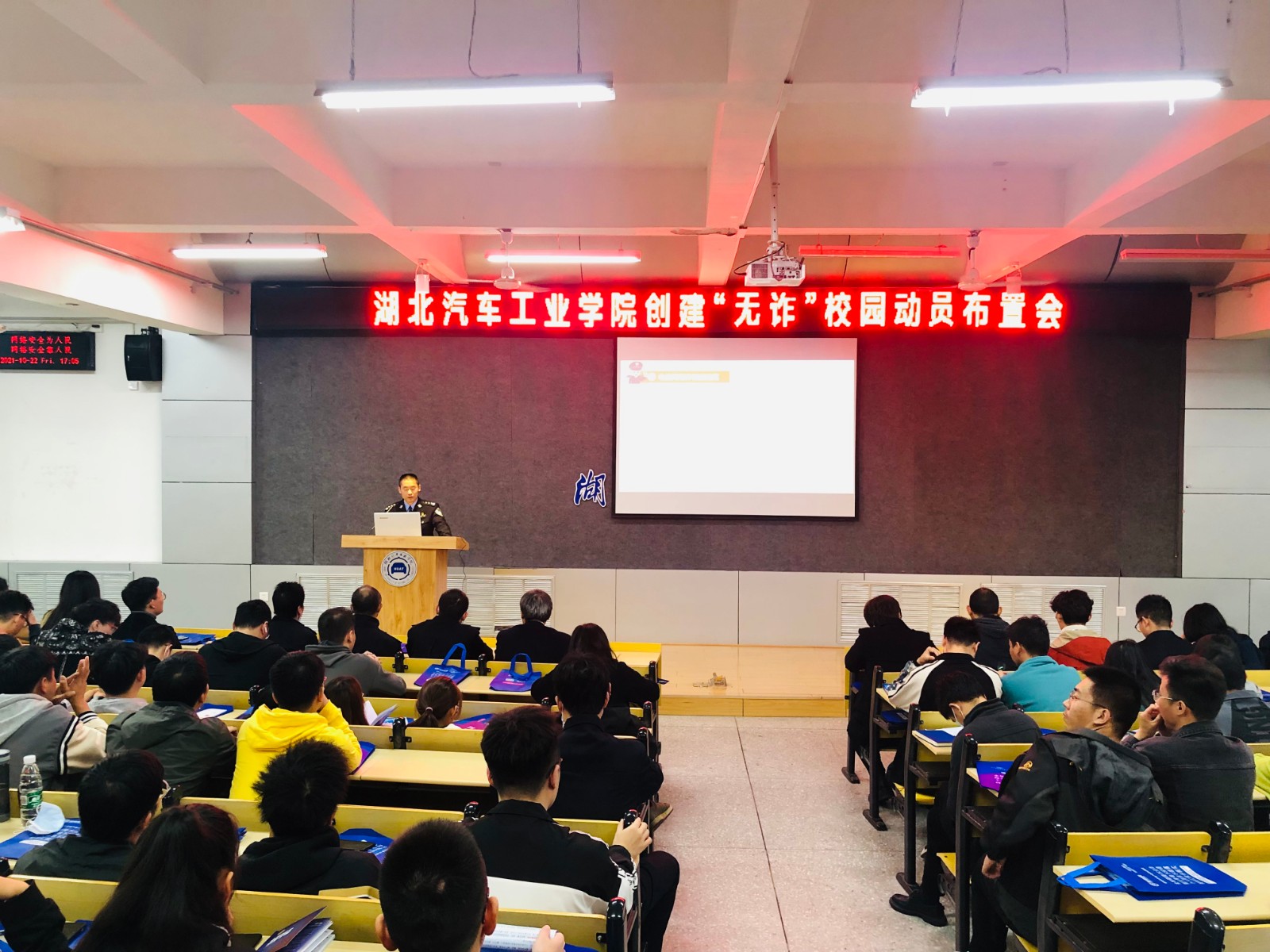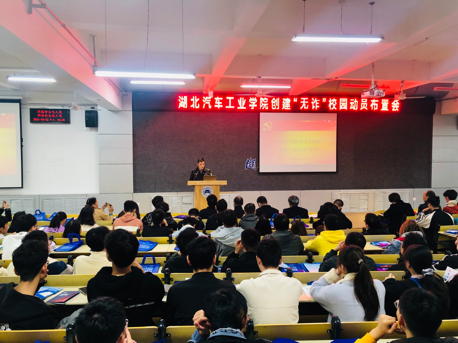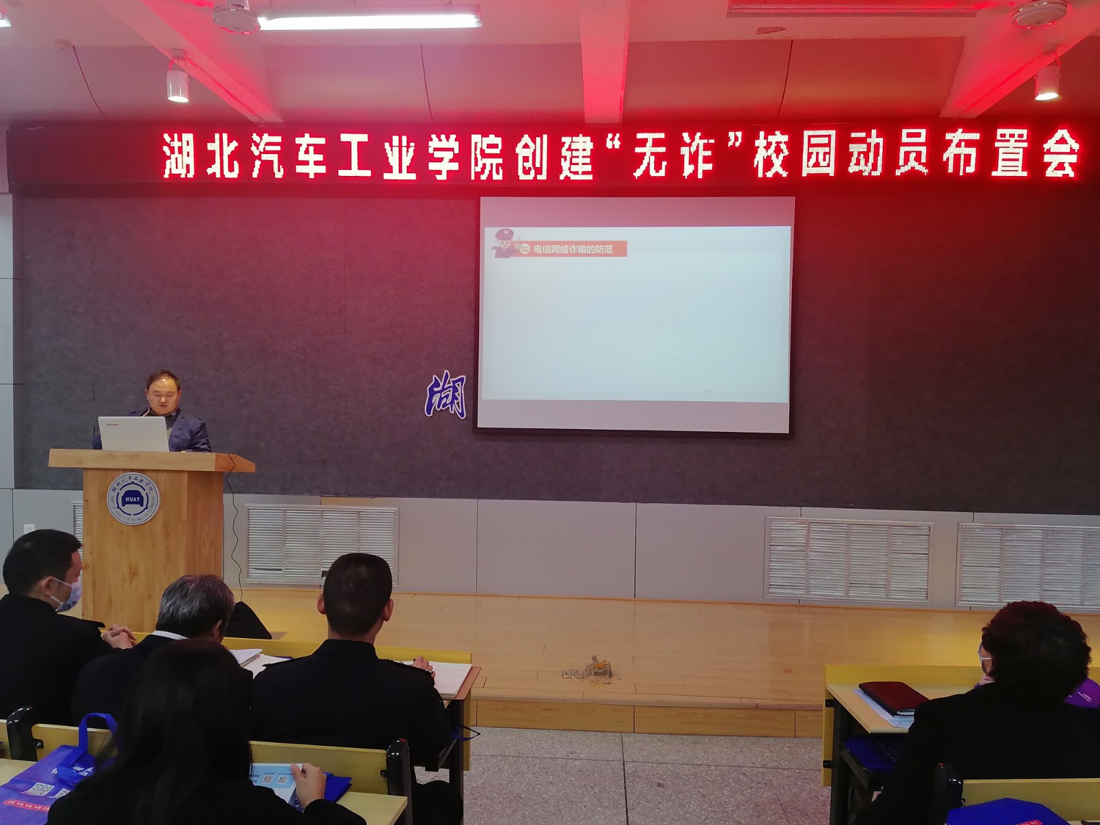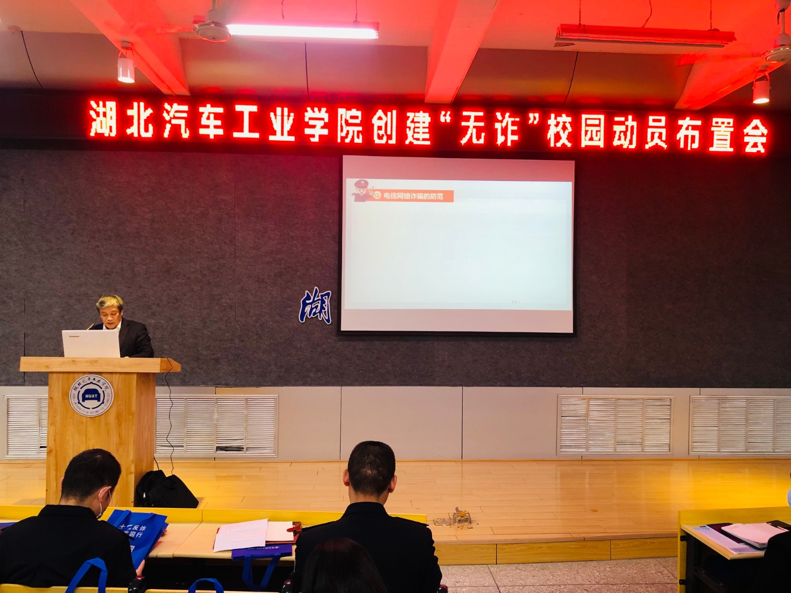 会上,中区派出所副所长石坤通报了学校电信诈骗案件警情,指出学校电诈案件以兼职刷单、投资理财、冒充身份和网络购物类居多。外国语学院学工办主任、分团委书记魏院珍老师以“多措并举 筑牢防范电信诈骗的安全防线”为题做了学院反电诈工作的经验交流。张小明警官用学校发生的几起真实电诈案例和精彩视频讲解了电诈的主要形式、主要特点和防范措施。宣读了《湖北汽车工业学院创建“无诈校园”工作方案》。