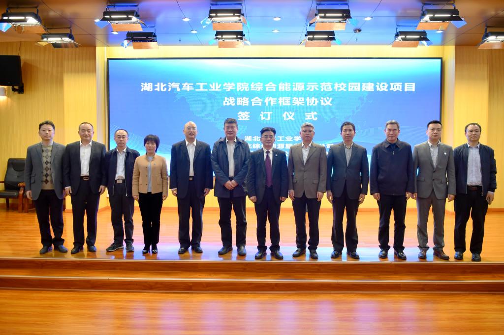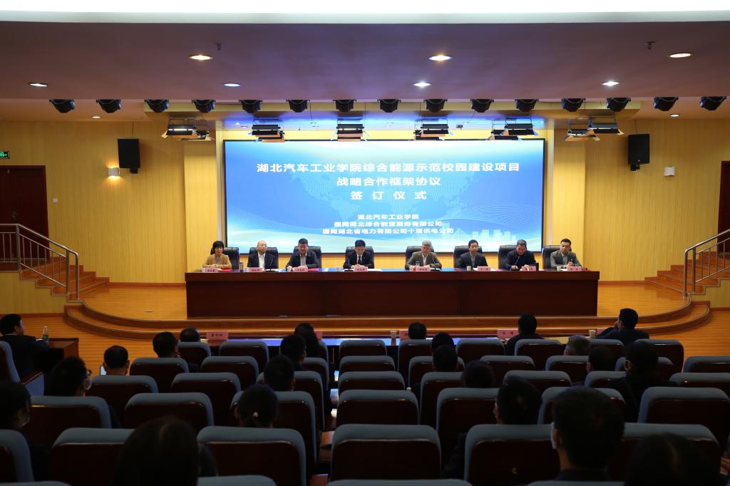 之后湖北汽车工业学院、国网湖北综合能源服务有限公司、国网十堰供电公司三方领导共同签署了《湖北汽车工业学院综合能源示范校园建设战略合作框架协议》。