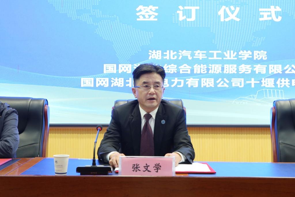 在签约仪式上,张文学校长对国网湖北省电力有限公司、综合能源公司、十堰供电公司各位领导、来宾表示热烈的欢迎和衷心的感谢。他介绍了学校历史沿革、发展现状、建设目标、服务国网等情况。他表示,湖北汽车工业学院作为伴随民族工业成长、发展和壮大的高等学府,全国唯一一所以汽车命名的公办本科高校,功底扎实、底蕴深厚,拥有近50建校历史,40年本科办学历史。学校扎根荆楚大地,根植汽车产业,服务地方经济社会发展,培养了10多万专业人才,当前学校已发展成为覆盖工、管、经、理、法、文、艺等七大学科门类的多科性大学。张文学指出,国家电网是中国关系国民经济命脉和国家能源安全的特大型国有重点骨干企业,湖北综合能源服务有限公司是学校非常重要的战略合作伙伴,与学校在发展清洁能源、能源管理、学生实习实训和教育管理等方面建立了长期稳定的合作关系。国网十堰分公司用专业高效的校园服务赢得了广大师生的认可和信赖,成为汽院师生最可靠的供能单位。国网湖北省电力有限公司抢抓数字经济发展先机,投资学校电网基础设施建设,建设“绿色、智慧、人文”校园,与学校共同探索未来高等教育的新模式,不仅将大力改善学校用能条件,助力学校打造绿色校园,而且将进一步提升校园能源服务管理的质量,在师生中产生更广泛的影响力,形成更加良好的社会声誉。