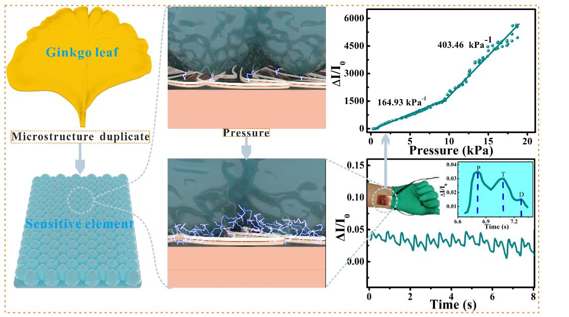 仿生电子皮肤触觉传感器是实现机器人智能化发展的先决条件。机器人等复杂的三维载体表面或活动关节部位,对压力感知、可延展的柔弹性电子皮肤高柔性、高弹性和灵活可调等适形性具有很高的要求,且具有广阔的应用前景。文章合理设计并实现了基于银杏叶结构仿生的柔性压阻式压力传感器。论文在工艺上首先将银杏叶表面微结构复刻到PDMS基底上,喷涂MXene胶体溶液作为敏感层,制备出了结构简单、成本低廉、性能稳定的柔性仿生压阻式压力传感器。为了进一步提高灵敏度,在基于MXene的敏感元件和传感器中的叉指电极之间通过静电纺丝技术纺织了一层PVA纤维。构筑的柔性仿生压力传感器表现出了403.46kPa-1的超高灵敏度、99.3ms的超快响应时间和12000次的循环稳定性。同时,柔性仿生压力传感器还表现出了在生理信号测试和人机交互领域的巨大应用潜力。