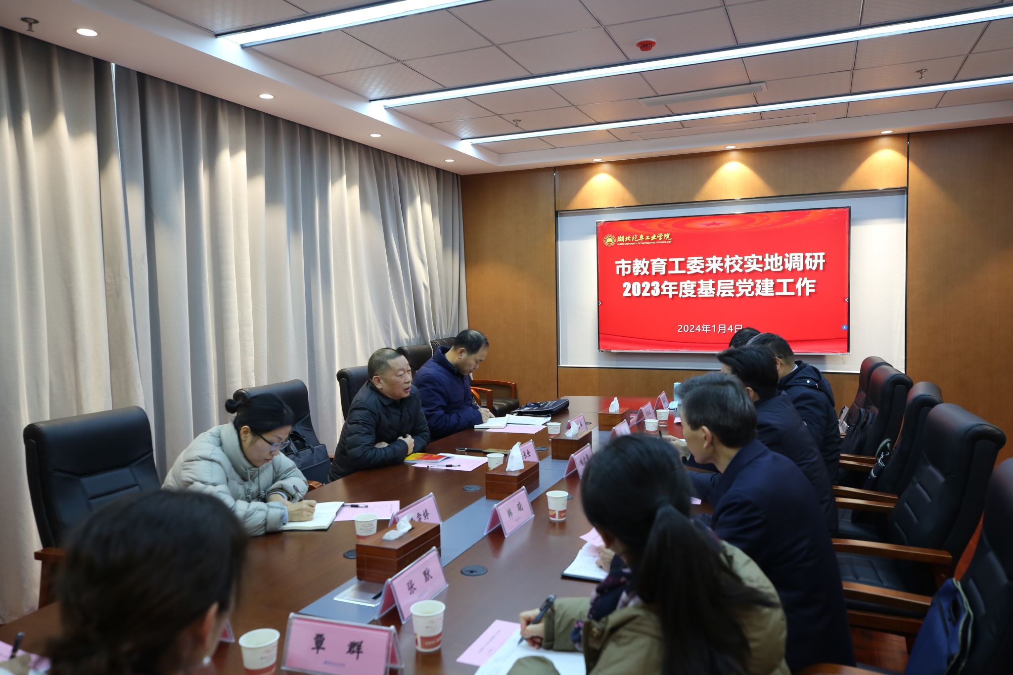 本网讯(文 王雪雪/图 李一凡)1月4日上午,十堰市委教育工委专职副书记陈长全一行3人莅临我校,对学校2023年度党建工作进行实地调研。调研工作在产教大楼三楼会议室举行,党委书记张文学,党委常委、组织部部长王镇,部分党群负责人和基层党组织书记共同参加了调研工作。