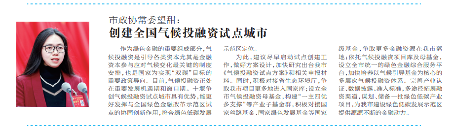 市政协常委、我校绿色低碳研究院副院长望甜在大会发言中指出,作为绿色金融的重要组成部分,气候投融资是引导各类资本尤其是金融资本参与应对气候变化最关键的制度安排,也是国家为实现“双碳”目标的重要政策导向。目前,气候投融资正处在重要发展机遇期和窗口期。十堰争创气候投融资试点城市具有优势,能更好发挥与全国绿色金融改革示范区试点的协同创新作用,符合绿色低碳发展示范区定位。为此,建议尽早启动试点创建工作,做好方案设计,加快研究出台我市《气候投融资试点方案》和相关申报材料。同时,积极对接省生态环境厅,争取我市项目更多地进入国家库;设立全市气候投融资母基金,构建“一主四优多支撑”等产业子基金群,积极对接国家丝路基金、国家绿色发展基金等国家级基金,争取更多金融资源在我市落地;依托气候投融资项目库及母基金,设立全市统一的绿色金融综合服务平台,加快培养以气候引导基金为核心的多层次气候投融资体系。完善产业认证、数据披露、准入标准,多途径拓展融资渠道,谋划、储备一批绿色低碳产业项目,为我市建设绿色低碳发展示范区提供源源不断的金融动力。(审稿 李保林)