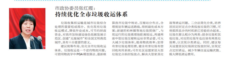 市政协委员、我校副校长张红霞在发言时指出,垃圾收集和运输是城市垃圾综合处理的重要组成部分。优化现有垃圾收运模式,降低作业成本,可节约财政资金,对我市加快建设绿色低碳发展示范区、创建“无废城市”和全国文明典范城市,具有十分重要的意义。建议统筹布局,优化全市垃圾收运体系。垃圾收运是一个逆向物流问题,可借用物流学中PGA模型算法,重新核算我市垃圾中转站、压缩站分布点,合理规划车辆运送路线,得到最优成本方案;新建的柏林镇等地垃圾焚烧厂,与现运行的垃圾填埋场距离较远,再建两座中型垃圾压缩转运站非常必要,可大大减少垃圾体积,提高物流效率;安排有害垃圾处理经费,健全有害垃圾有偿回收利用系统;可在社区设置家居大型垃圾定点临时投放点,解决大型家具垃圾等清运问题。二分法简化分类,培养居民定时定点分类投放垃圾的习惯,可将郧西县沙沟村和浙江经验结合起来,垃圾在源头粗分为两类:厨余垃圾和其他垃圾,对应的垃圾车也应该有两类垃圾箱,以实现分类清运。同时,建议每天设置居民垃圾固定投放时间,实现定点定时清运。减少车辆往返运输次数,极大降低清运费用。
