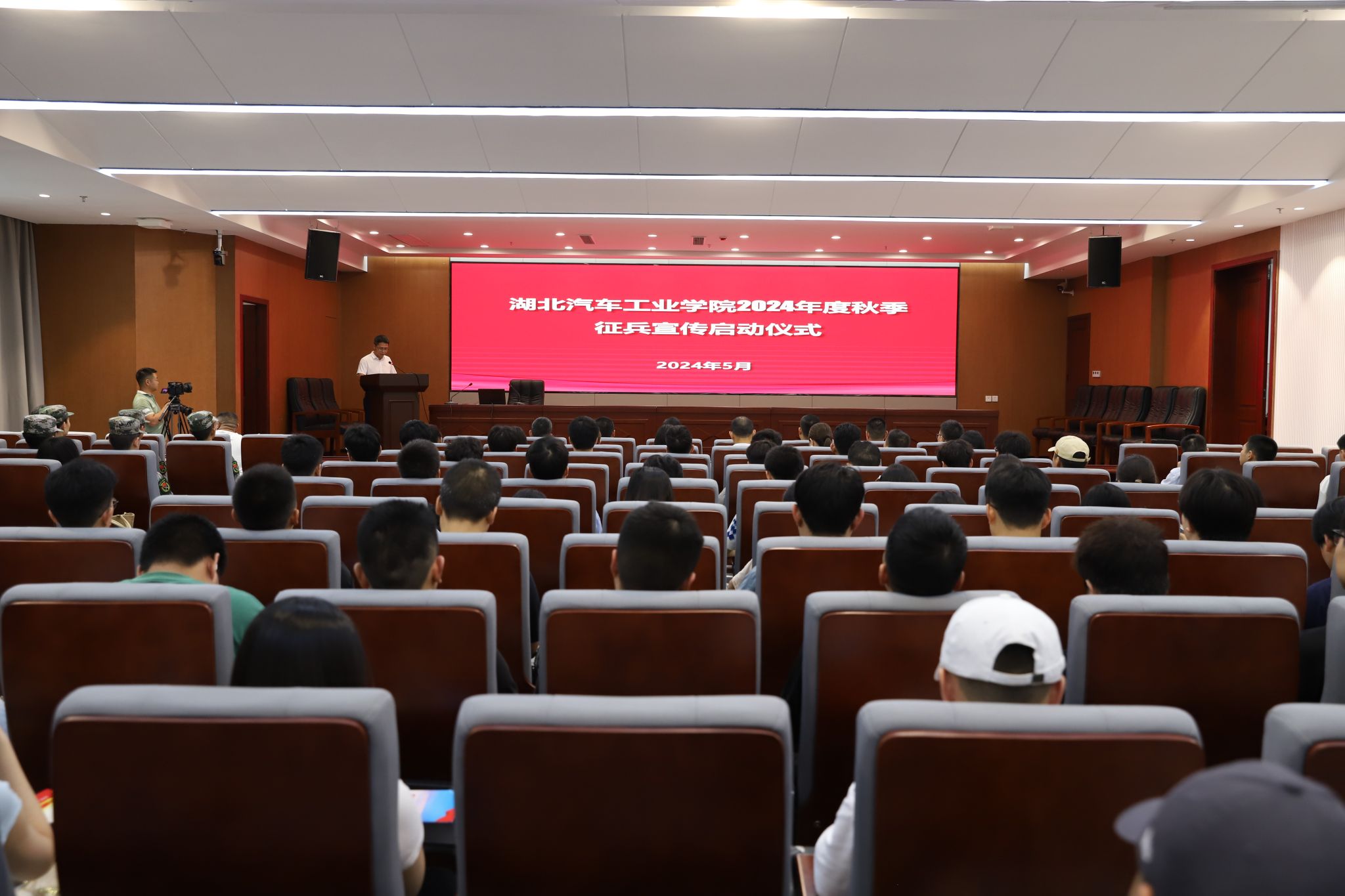 本网讯(文 薛树森/图 邓玉洁)5月29日下午,我校2024年度秋季大学生征兵宣传工作启动仪式在产教大楼三楼报告厅举行。校党委常委、征兵工作领导小组副组长王文山、十堰军分区动员处处长赖武明上校、参谋赵起超中校、张湾区武装部政委孙国柱上校、人武干事陈宇飞出席了启动仪式。仪式由保卫处(武装部)处(部)长杨长春主持。