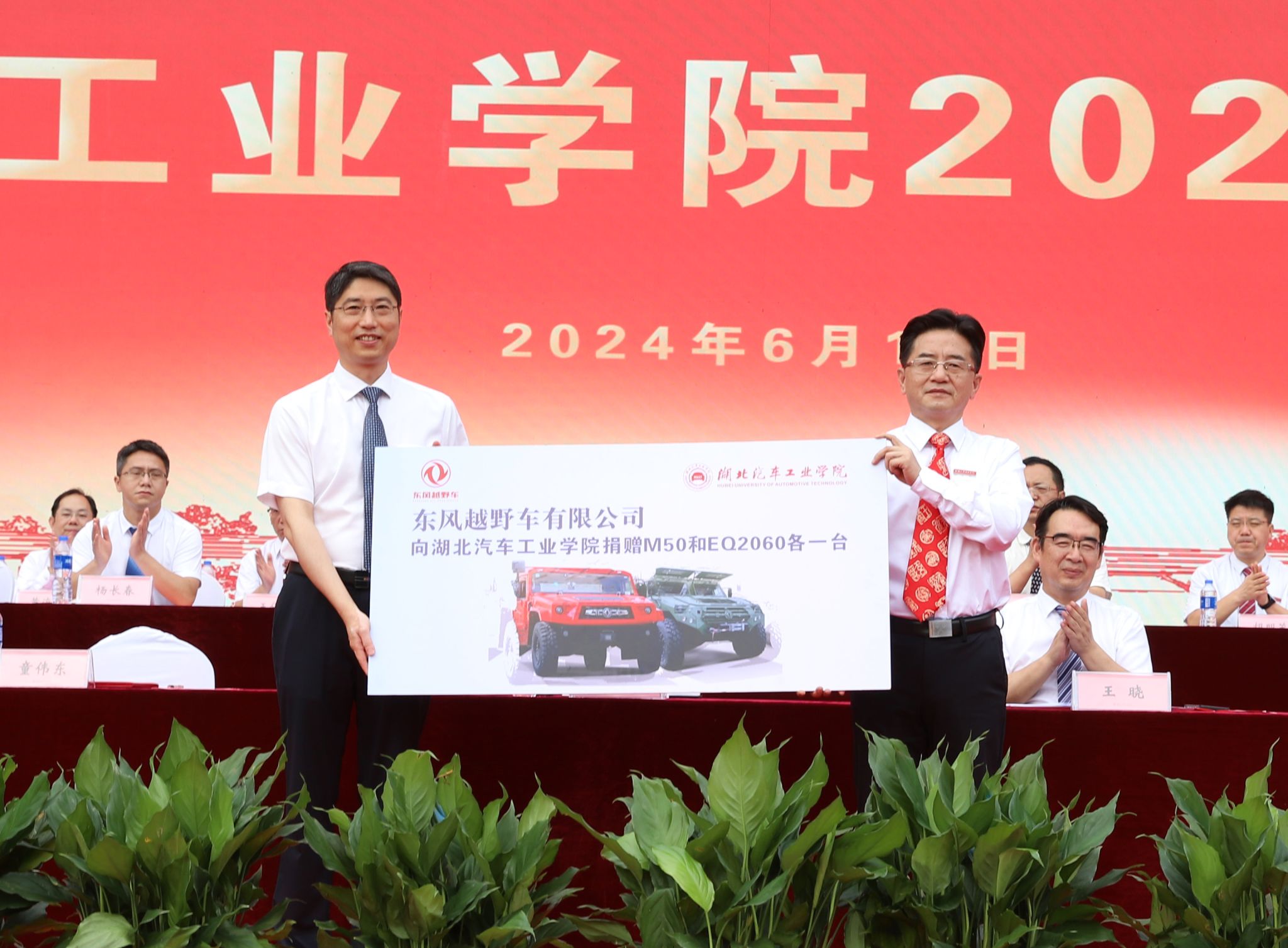 东风越野车有限公司党委书记童伟东代表公司向学校捐赠两台猛士车辆,并作为企业代表发言。他表示,汽院与东风血脉相融、同根同源,汽院培养的青年人才动手能力强、不怕吃苦、肯钻研技术,是公认“留得下、用得上、有后劲”的优秀员工。他鼓励汽院学子们保持观察和思考的能力,抓住真问题;不懈摸索和奋斗,敢下真功夫;主动担当和实践,苦练真本领。党委书记张文学代表学校接受捐赠,并向东风越野车有限公司颁发捐赠证书。