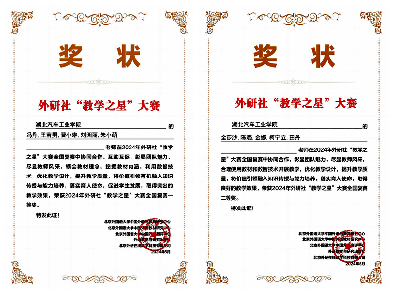 本网讯(文/冯丹)近日,由北京外国语大学中国外语与教育研究中心、北京外国语大学中国外语教材研究中心、北京外国语大学中国外语测评中心、外语教学与研究出版社和北京外研在线数字科技有限公司共同举办的2024年外研社“教学之星”大赛公布了获奖名单。我校外国语学院冯丹老师团队荣获大学英语组全国复赛一等奖,全莎沙老师团队荣获英语专业组全国复赛二等奖。