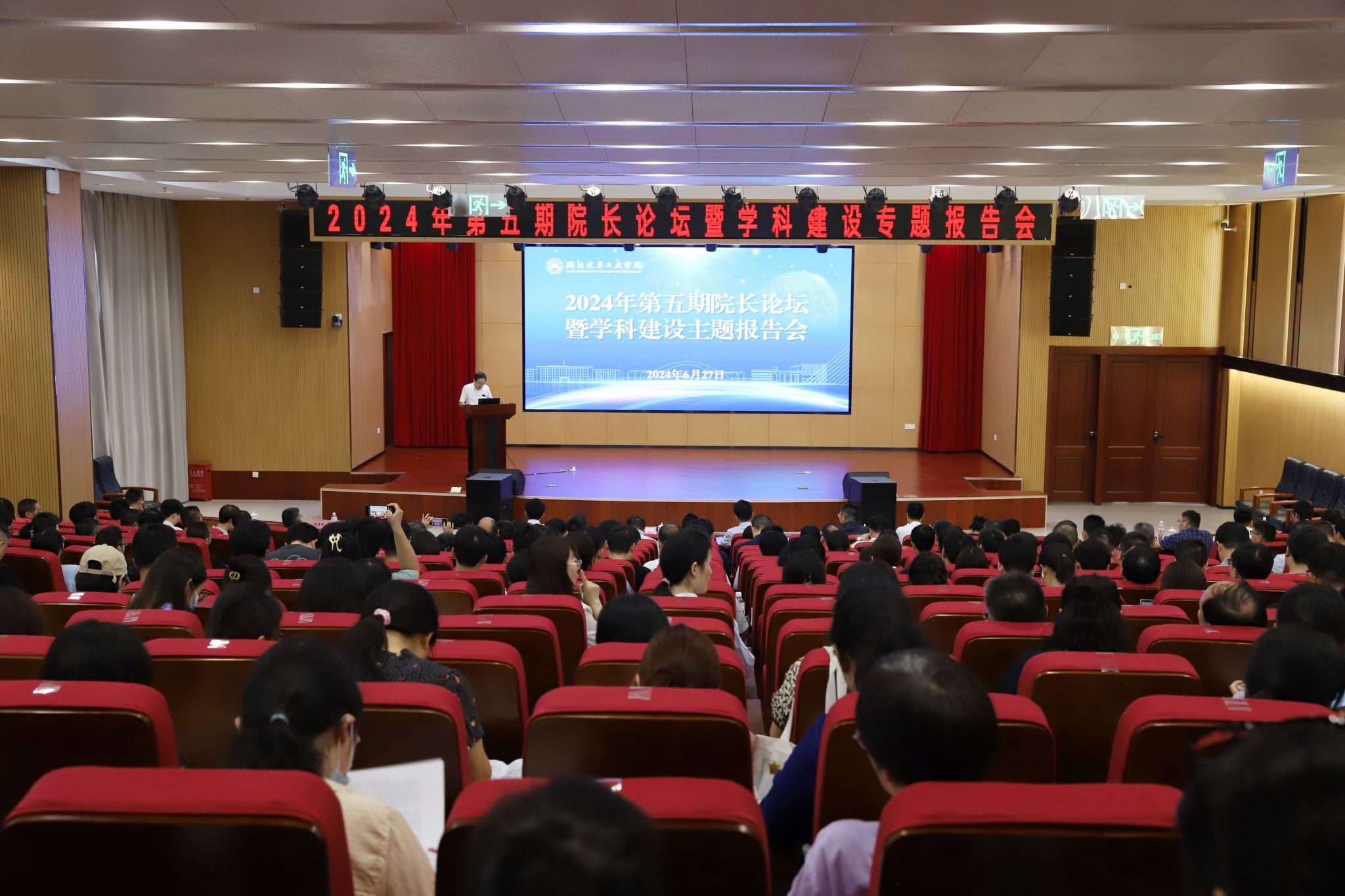 本网讯(文 何静/图 邓玉洁)6月27日下午,学校在产教大楼四楼报告厅举行第五期院长论坛暨学科建设专题报告会。全体在家校领导、各职能部门负责人、二级学院(部)党政领导班子,以及学术科研骨干和青年博士教师代表聆听报告。报告会由党委副书记李涛主持。