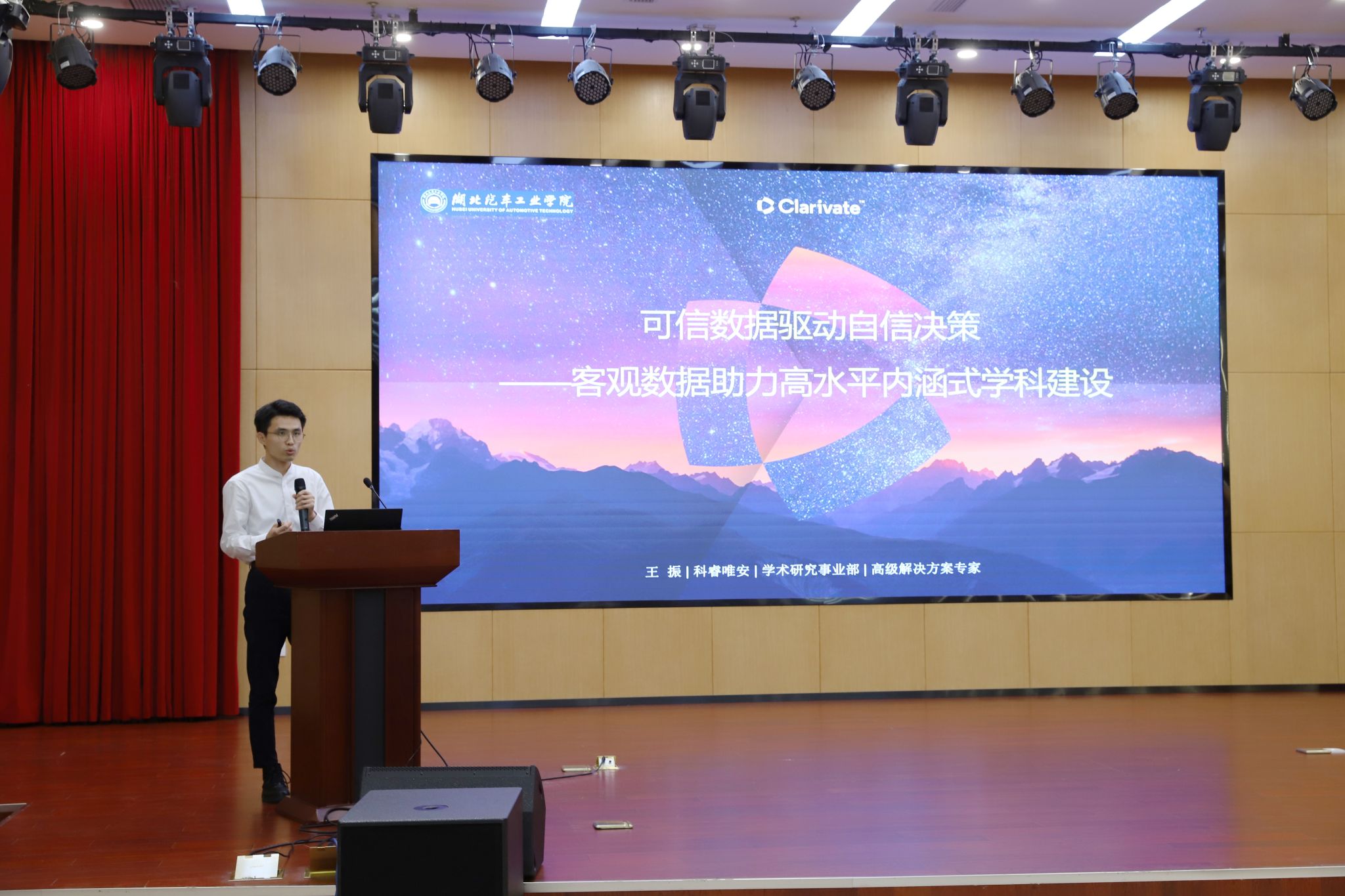 科睿唯安解决方案资深专家王振,以“加强学科内涵建设、促进高水平科研创新”为主题,围绕科研绩效评价、ESI学科建设、科研成果产出等多个维度,结合详实的实例分析,可视化地介绍学科发展态势,就如何深化学科分析、助力学科建设做了深入的探讨和讲解。
