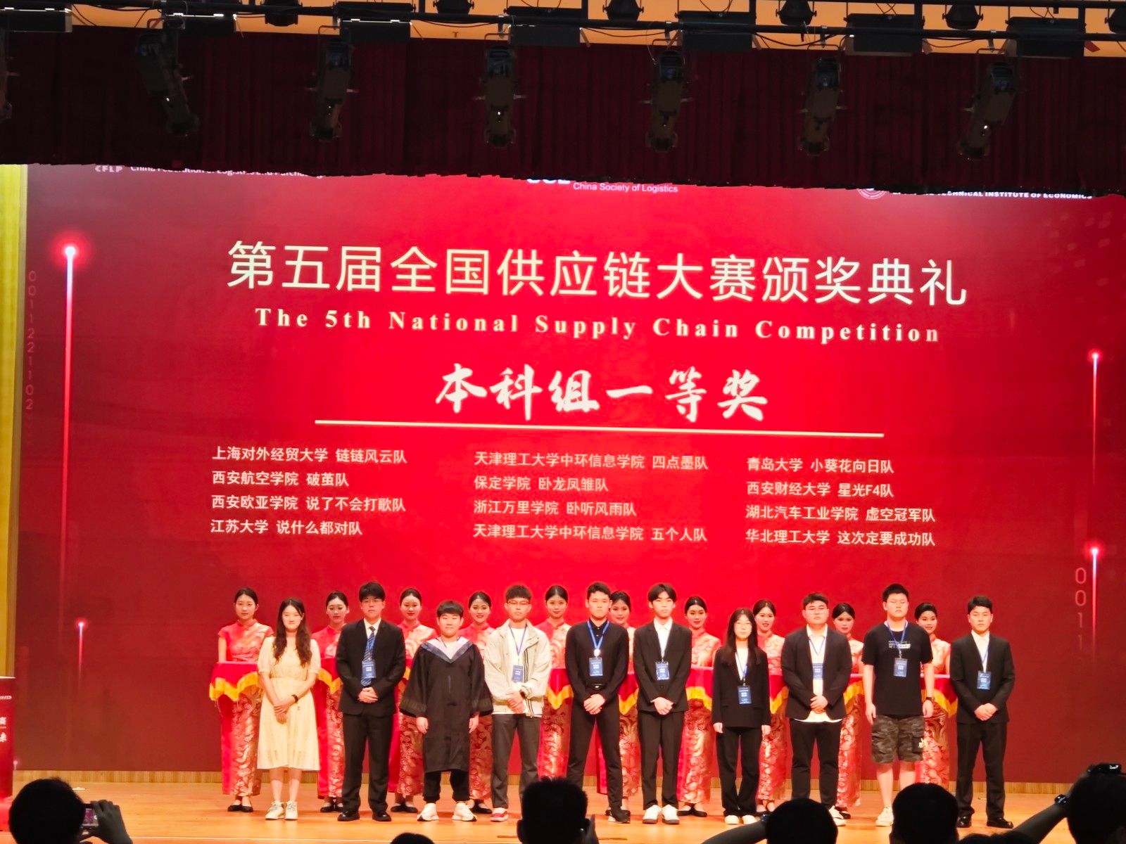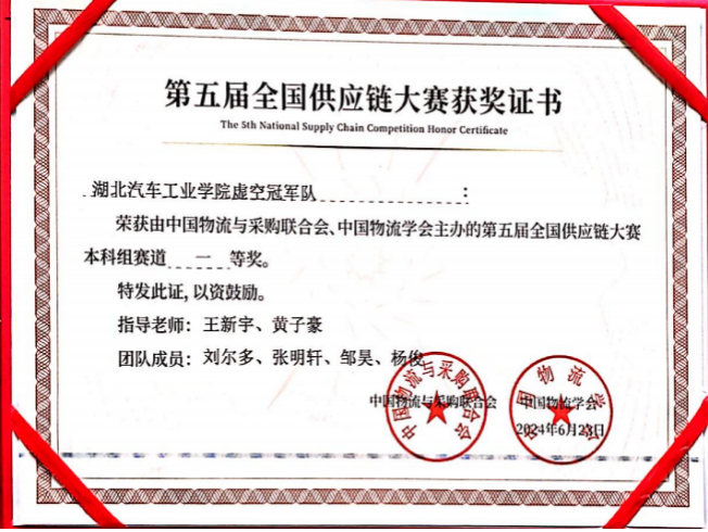 本网讯(文/图 黄子豪)近日,第五届全国供应链大赛决赛在杭州举行,由湖北汽车工业学院经济管理学院物流专业王新宇老师、黄子豪老师指导,2021级物流管理本科生刘尔多、邹昊、杨俊、张明轩组建的“湖北汽车工业学院虚空冠军队”通过团队协作,在不间断比拼中展现了优秀的供应链实战能力,斩获了本科赛道一等奖,全国第二名的优异成绩。这是我校入围全国决赛以来取得的最高成绩。获得一等奖的参赛学生还获得了由中国物流与联合采购会颁发的供应链管理师职业能力中级证书。