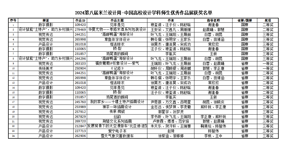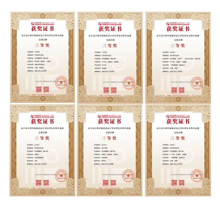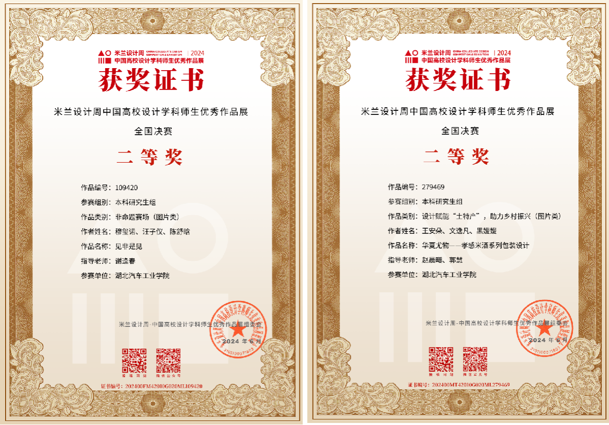 本网讯(文/图 吕文卉)近日,2024第八届米兰设计周中国高校设计学科师生优秀作品展公布了获奖名单,我校艺术与设计学院共斩获大奖24项,其中国家级二等奖2项、三等奖6项;省级一等奖2项、二等奖6项、三等奖8项。
