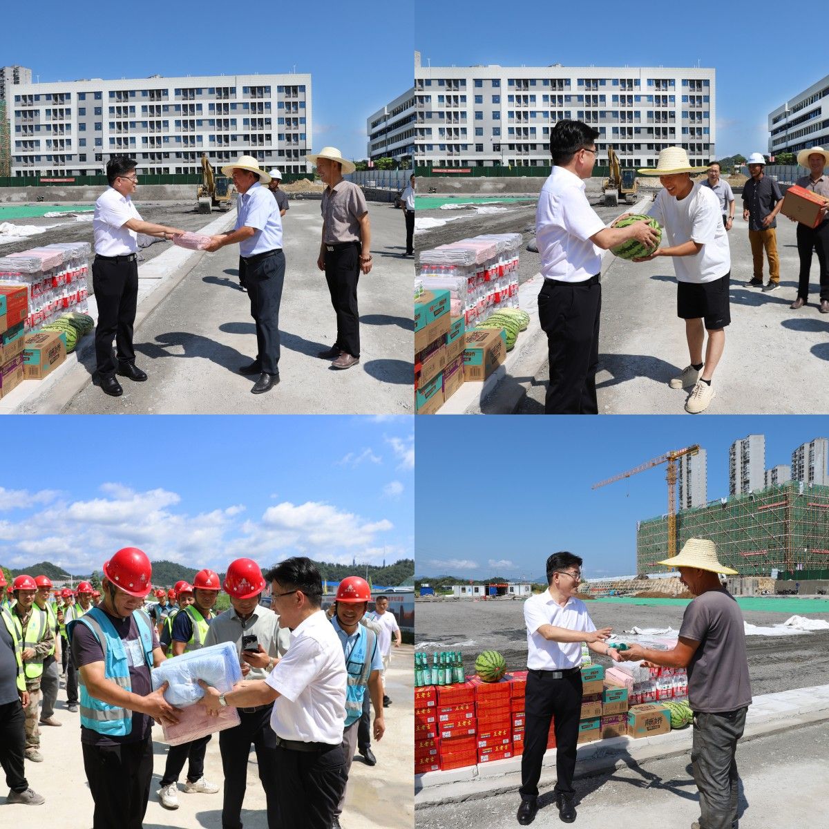 张文学一行深入梅园2号学生公寓和梅园操场建设以及教学楼装修改造工地现场,实地察看项目建设进展情况,为一线基建人员送上了西瓜、凉茶、饮用水、藿香正气水、毛巾等防暑降温物品,将学校党委、行政的深切关怀传递到每一位现场人员的心中。