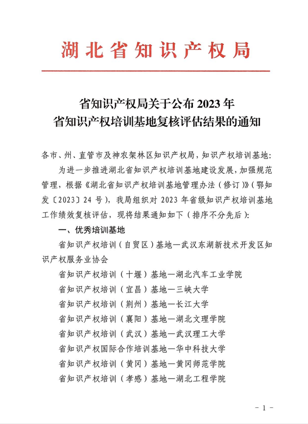 本网讯(文/肖玉杰)8月16日,湖北省知识产权局发文公布2023年省级知识产权培训基地绩效复核结果,湖北省知识产权培训基地—湖北汽车工业学院(以下简称“基地”)获评“优秀”基地。这是我校知识产权基地自2015年4月成立以来,连续第五次获得“优秀”等次,也是全省唯一一家连续9年获得优秀等次的培训基地。