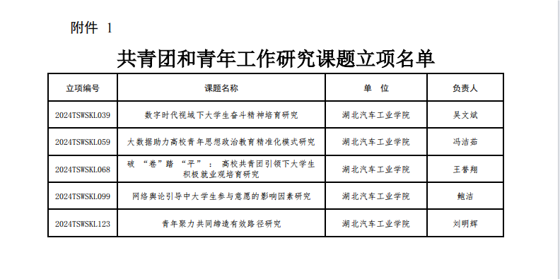 本网讯(文/鲍洁)近日,团省委、湖北省社会科学界联合会下发通知,学校5个项目获批2024年度湖北省共青团和青少年工作研究课题立项,立项数量达历史最高水平,我校教师参与团员与青年工作积极性和能力水平显著提升。