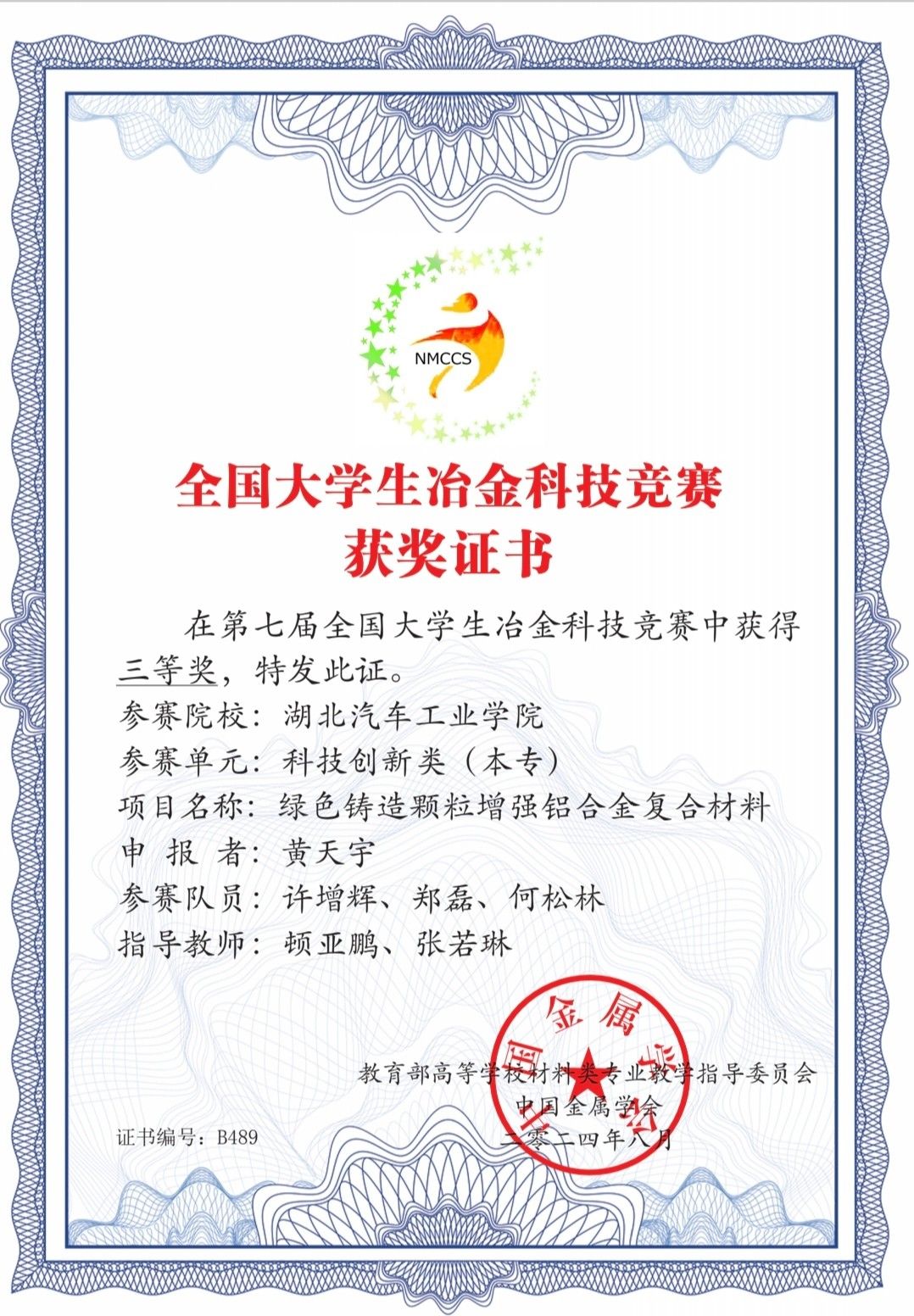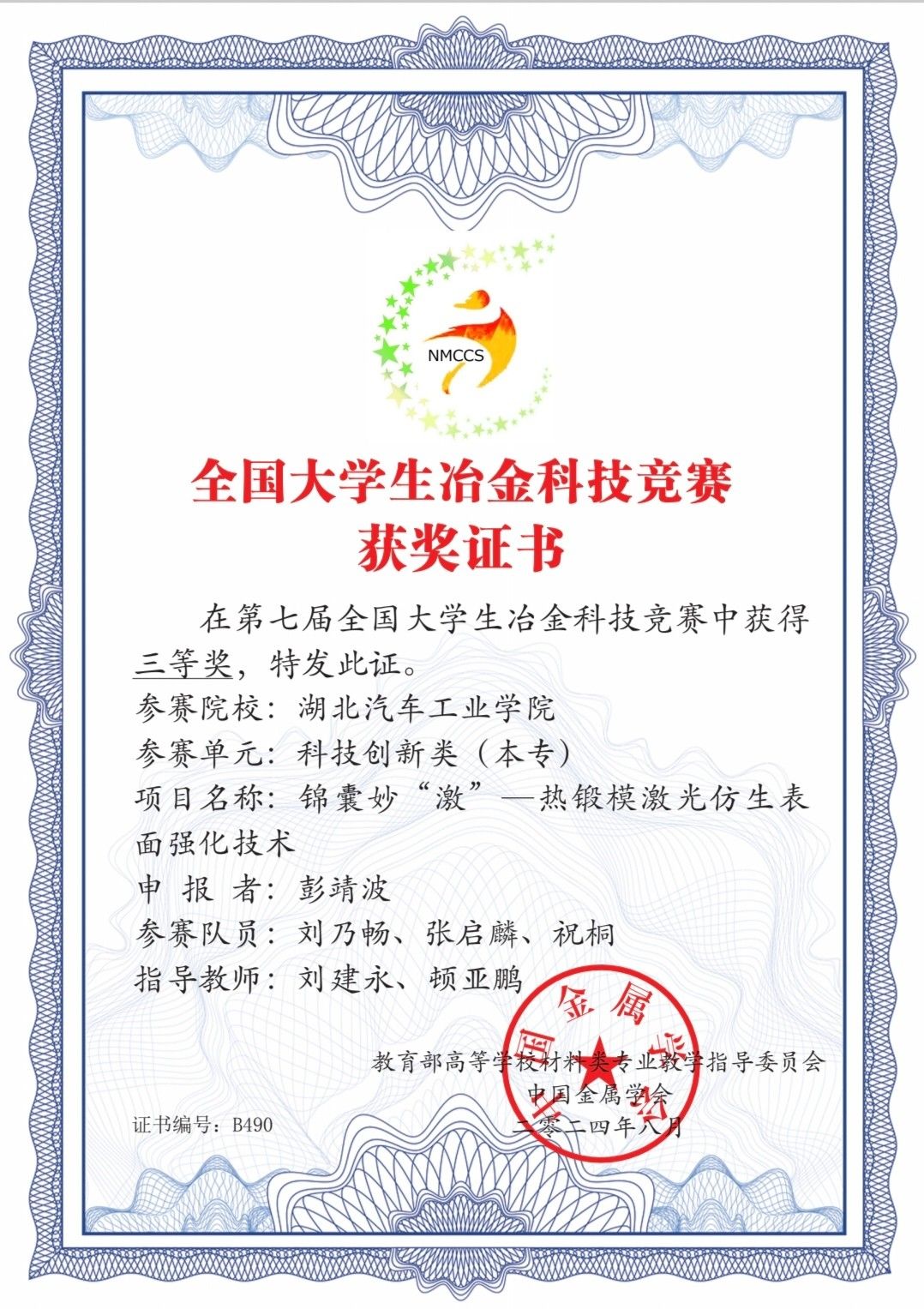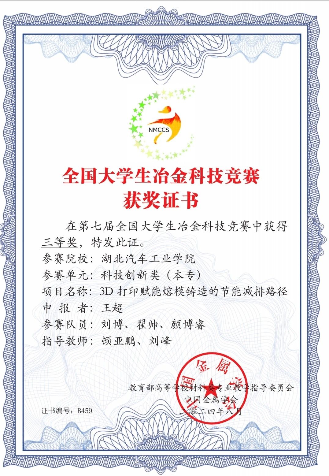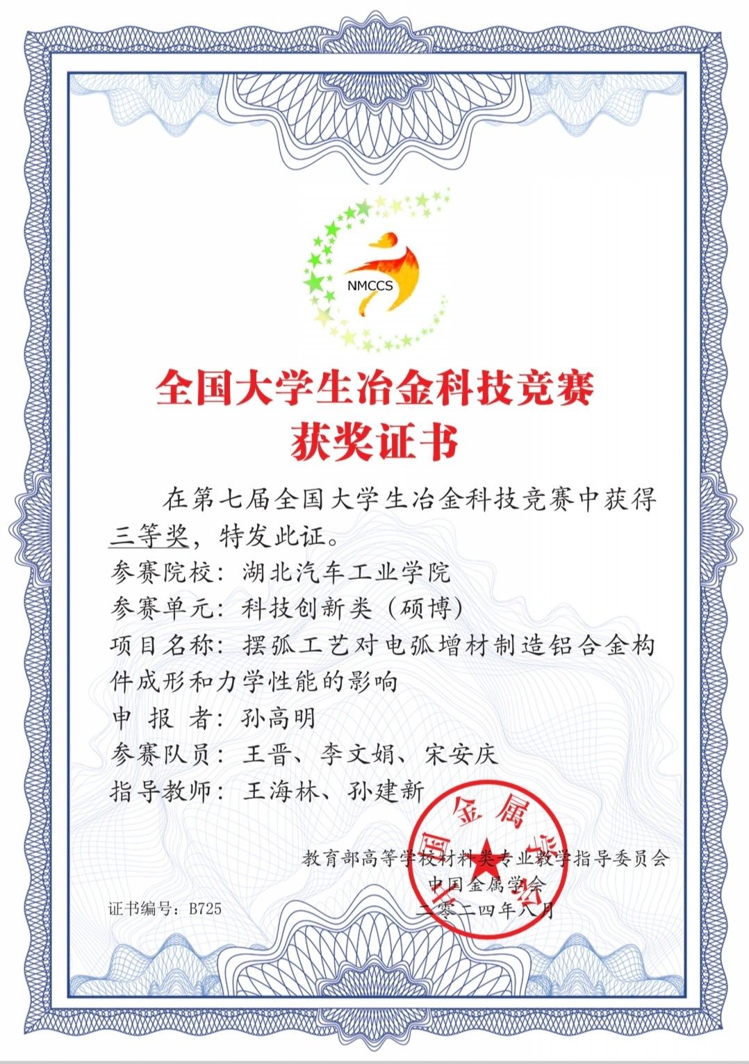 来自全国25个省、自治区和直辖市的2112支队伍参加了本次比赛,比赛包括创意设计竞赛、科技创新竞赛、仿真实训竞赛等三个竞赛单元,经过初审、会评,最终我校材料学院学子王超的《3D打印赋能熔模铸造的节能减排路径》、黄天宇的《绿色铸造颗粒增强铝合金复合材料》、彭靖波的《锦囊妙“激”—热锻模激光仿生表面强化技术》、硕士生孙高明的《摆弧工艺对电弧增材制造铝合金构件成形和力学性能的影响》作品喜获全国三等奖。