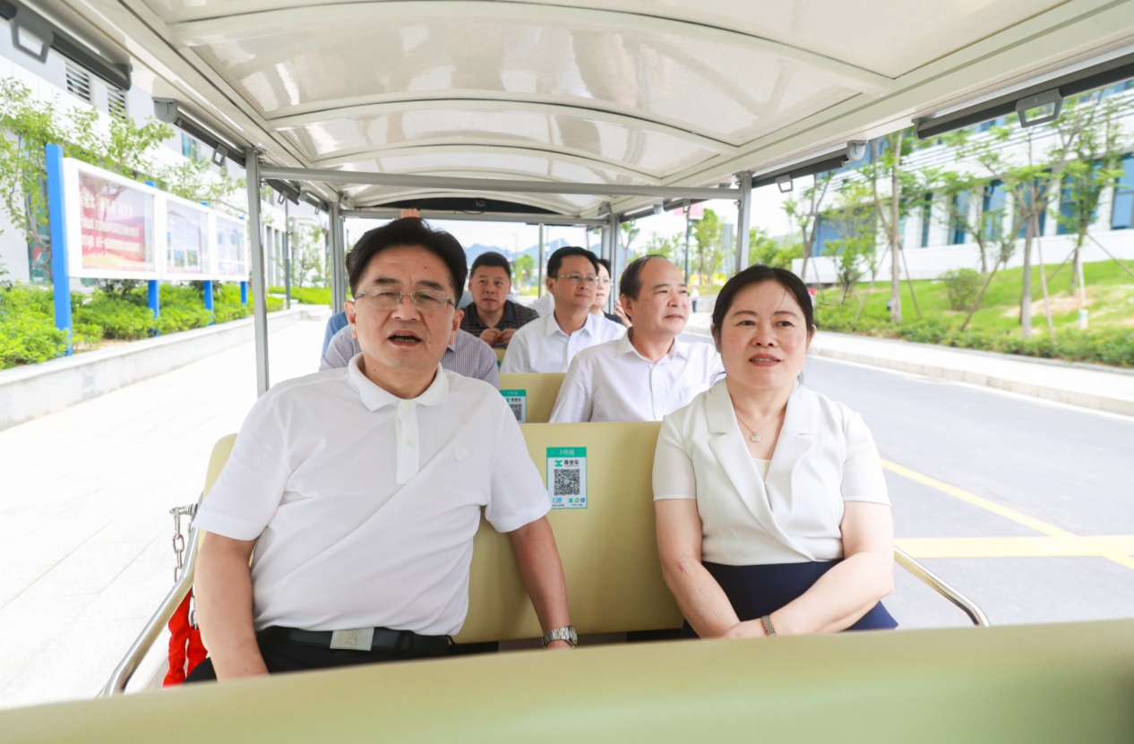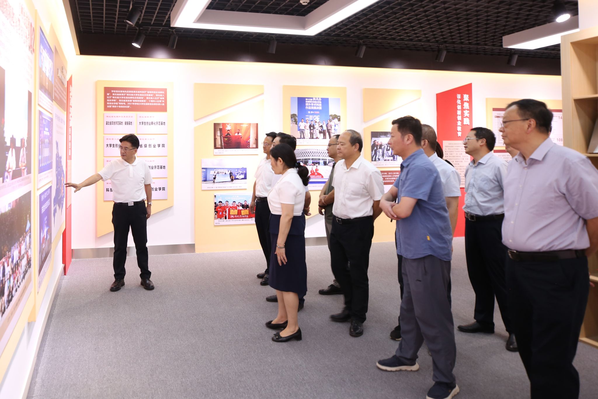 调研组一行参观了学校发展大道新校门,了解了学校扩建校区建设和规划情况,并亲自乘坐校内摆渡车到校史馆参观。张文学亲自为调研组介绍学校的发展历史和办学取得的成就。在科创展示交流中心参观时,调研组对学生创新创业取得的成果表示由衷的赞赏。
