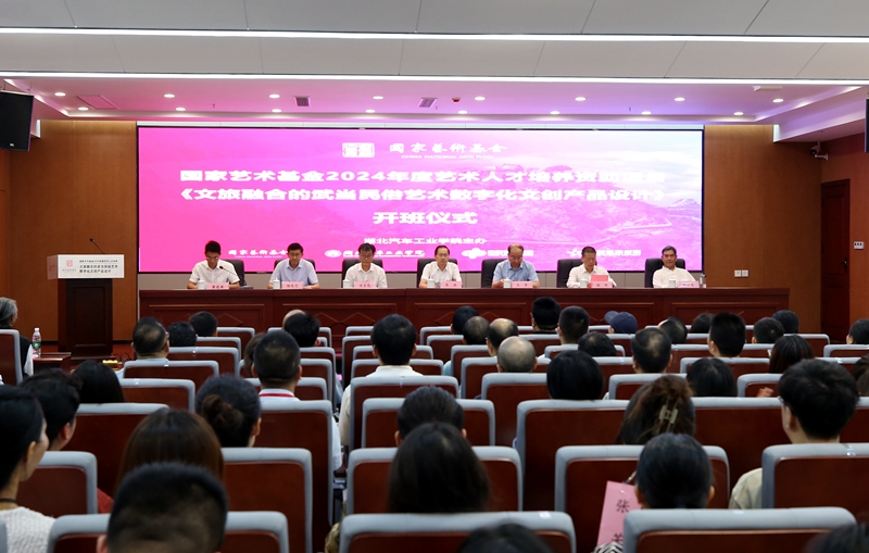 本网讯(文 何沛然/图 李一凡)9月1日上午,国家艺术基金2024年度人才培养资助项目“文旅融合的武当民俗艺术数字化文创产品设计”在湖北汽车工业学院开班。湖北省文化和旅游厅艺术处处长王军、十堰市文化和旅游局党组副书记、副局长凌吉先、十堰市社科联副主席温明,学校党委副书记李涛、武当文化研究与传播中心主任杨立志以及兄弟高校、行业协会、合作企事业单位代表等20余位领导嘉宾出席开班仪式。学校相关职能部门、二级学院负责人,师生代表,以及来自全国各地的30名培训班学员共同参加开班式。