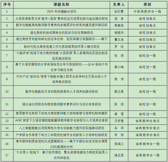 本网讯(文/肖玲莉)近日,中国高等教育学会、省教育科学规划及省高教学会相继公布了2024年度立项课题名单,我校共有17项课题获准立项,其中,重点课题8项、一般课题9项。立项级别及数量较往年均有所提升,特别是在重点项目立项数量上实现新突破。