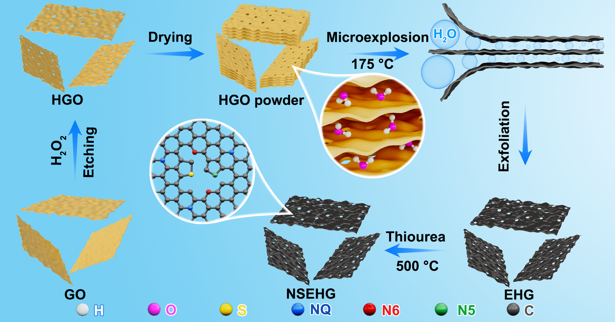 本网讯(文/秦蒙)近日,国际材料领域顶尖期刊《Advanced Materials》 (IF=27.4)在线发表了我校储能与动力电池湖北省重点实验室题为“Ultrahigh Pyridinic/Pyrrolic N Enables N/S Co-Doped Holey Graphene with Accelerated Kinetics for Alkali-Ion Batteries”的研究论文。该研究首次发现并揭示了氧化石墨烯低温微爆炸热剥离的现象和机理。所制备的超高含量吡啶氮、吡咯氮加速了氮/硫共掺杂多孔石墨烯的储钾反应动力学,作为钾离子电池负极材料具有优异的倍率和循环性能,优于已报道的石墨烯材料。