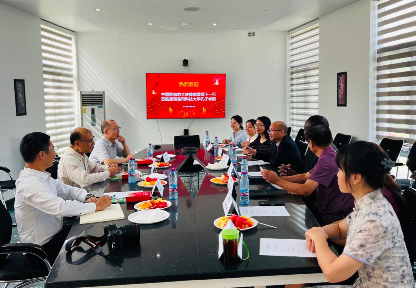 外方院长杜耀东(Daniel Duah)由衷感谢童大使一行的到来,并表示将积极争取资源,为中文专业建设、中文教学和文化活动创造更好条件;强化两校工程类专业深度合作,联合建立汽车研究中心和实习基地,推动特色孔院发展。