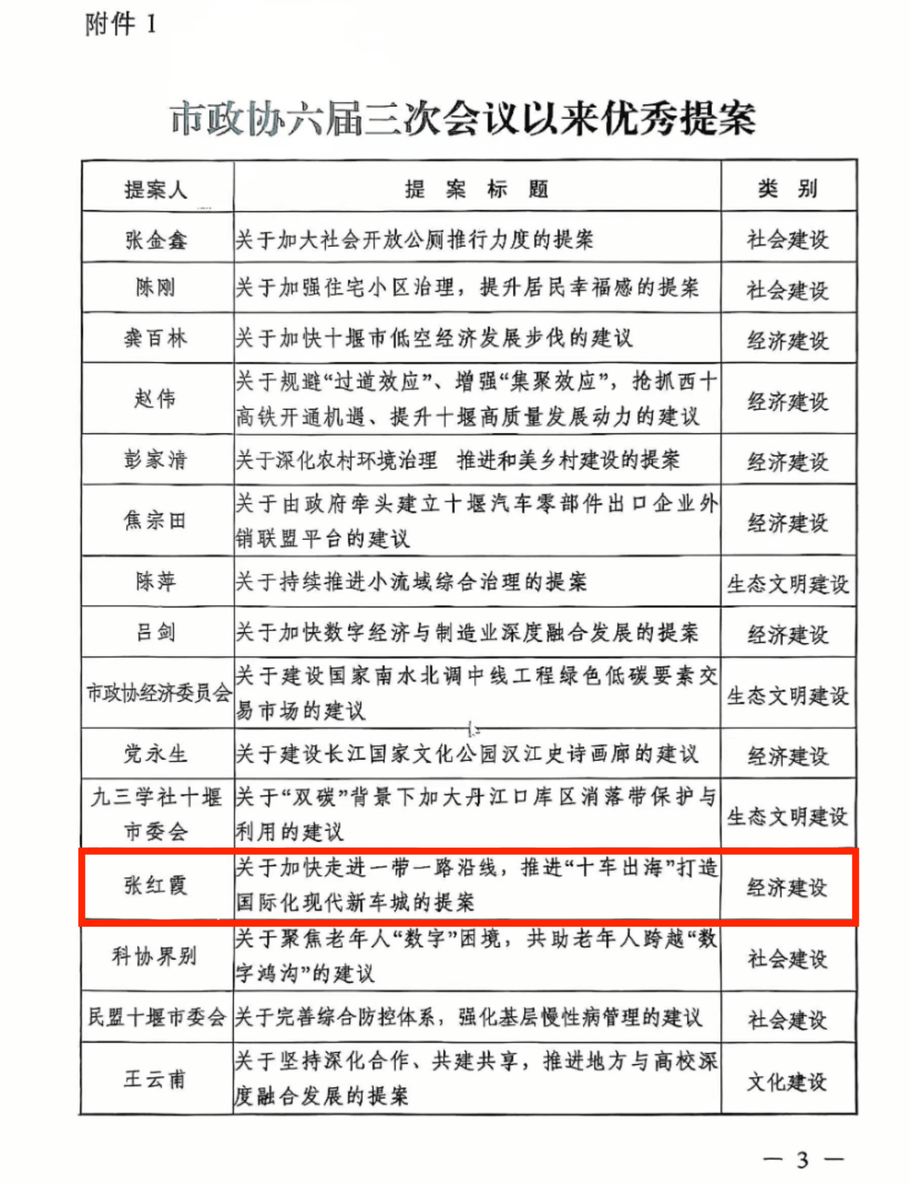 会上,政协十堰市委员会对《关于加大社会开放公厕推行力度的提案》等15件优秀提案和市委办公室等10个提案办理先进单位予以通报表扬。作为十堰市政协委员,张红霞多年来认真履行职责,充分发挥自身优势,积极关注汽车行业发展前沿,关注十堰经济社会发展的突出问题和涉及国计民生的重大课题并积极建言献策,深受好评。