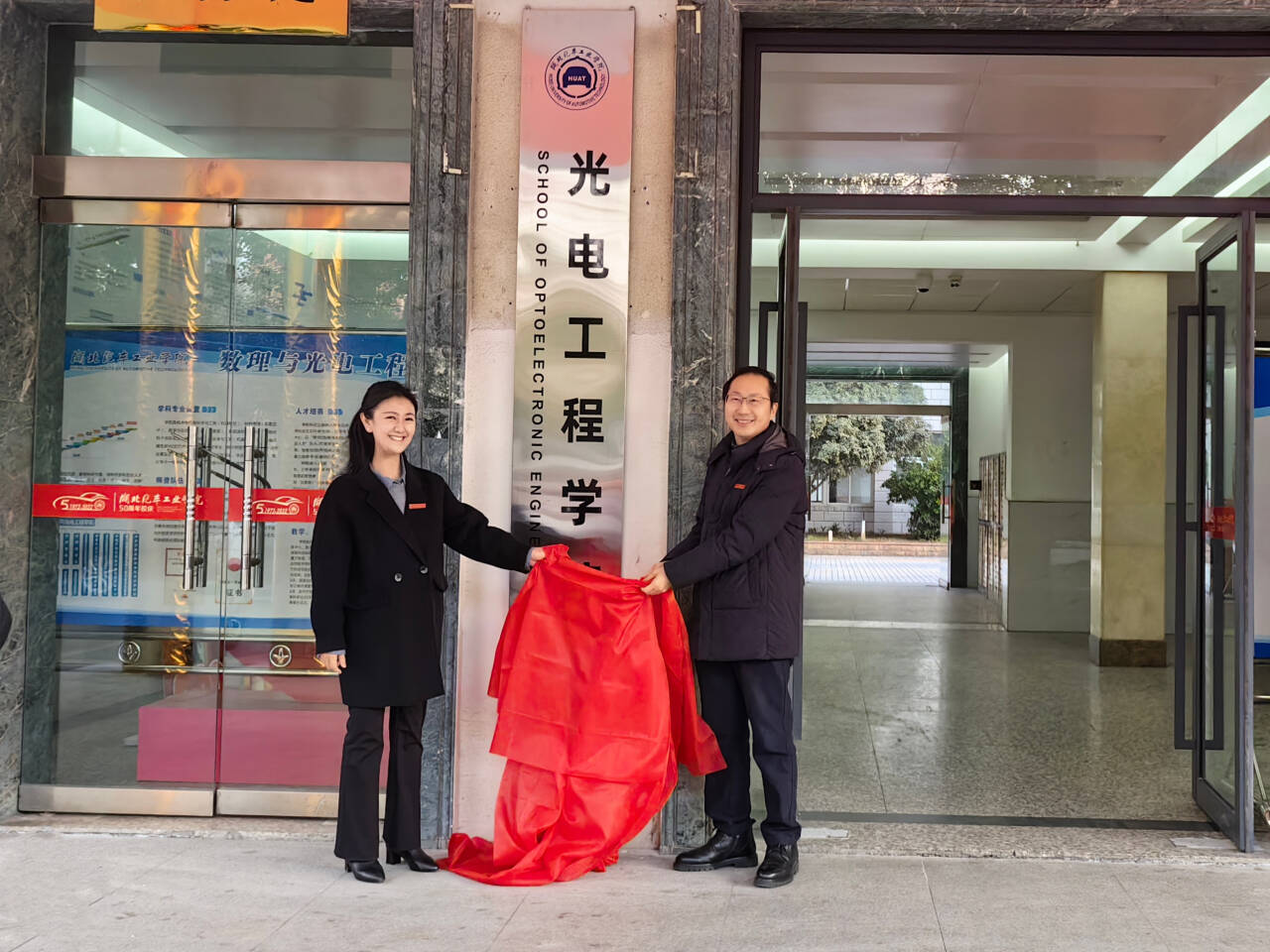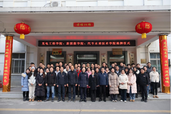 本网讯(文 汪栖如/图 秦运来)1月17日,光电工程学院、新能源学院、汽车未来技术学院揭牌仪式在第一教学楼门口举行,校党委副书记李涛书记出席,学院全体领导班子、各系部办公室负责人、教师代表、学生代表参加仪式,一同见证这一历史时刻。揭牌仪式由学院党委书记张默主持。