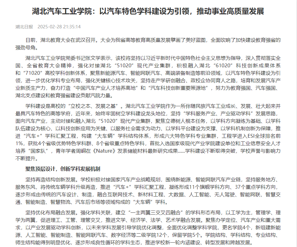 【湖北日报】湖北汽车工业学院:以汽车特色学科建设为引领,推动事业高质量发展