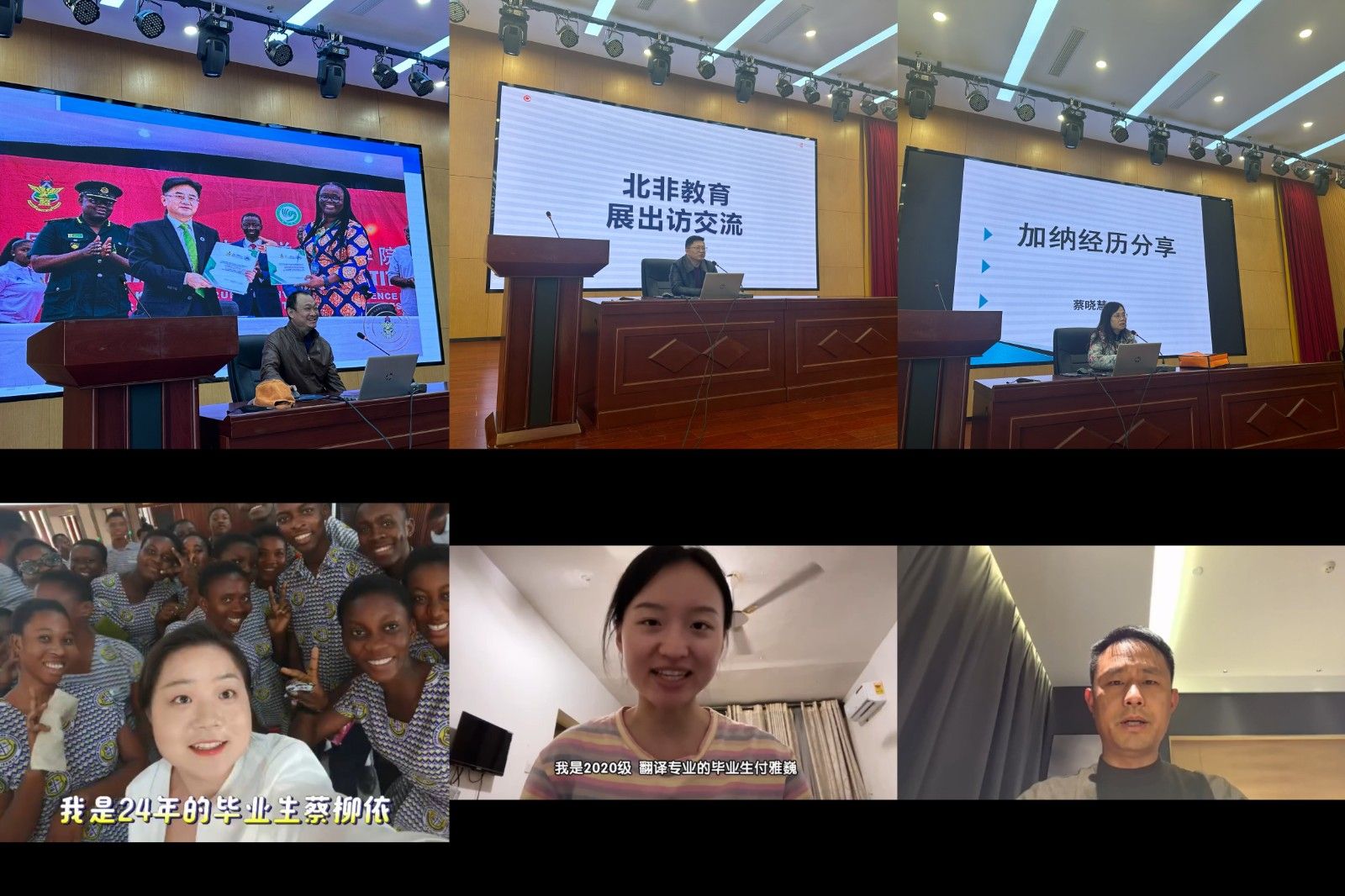 外语外贸学院教师闵祖传、蔡晓慧分享了在非洲加纳孔子学院的工作生活和收获。教学质量监控与评估中心主任钱洁汇报了出访北非的成果与感悟,在大力宣传学校的同时也深入了解了非洲教育现状及需求。2024届毕业生蔡柳依、付雅巍以视频的形式展示了加纳的风土人情以及作为孔子学院国际中文志愿者的工作和生活情况。2012届校友三一集团西非大区总经理许海超视频分享了个人在非洲十余年的工作经历,讲述了非洲广阔的发展前景,并鼓励学弟学妹学好专业知识,勇敢走向世界。