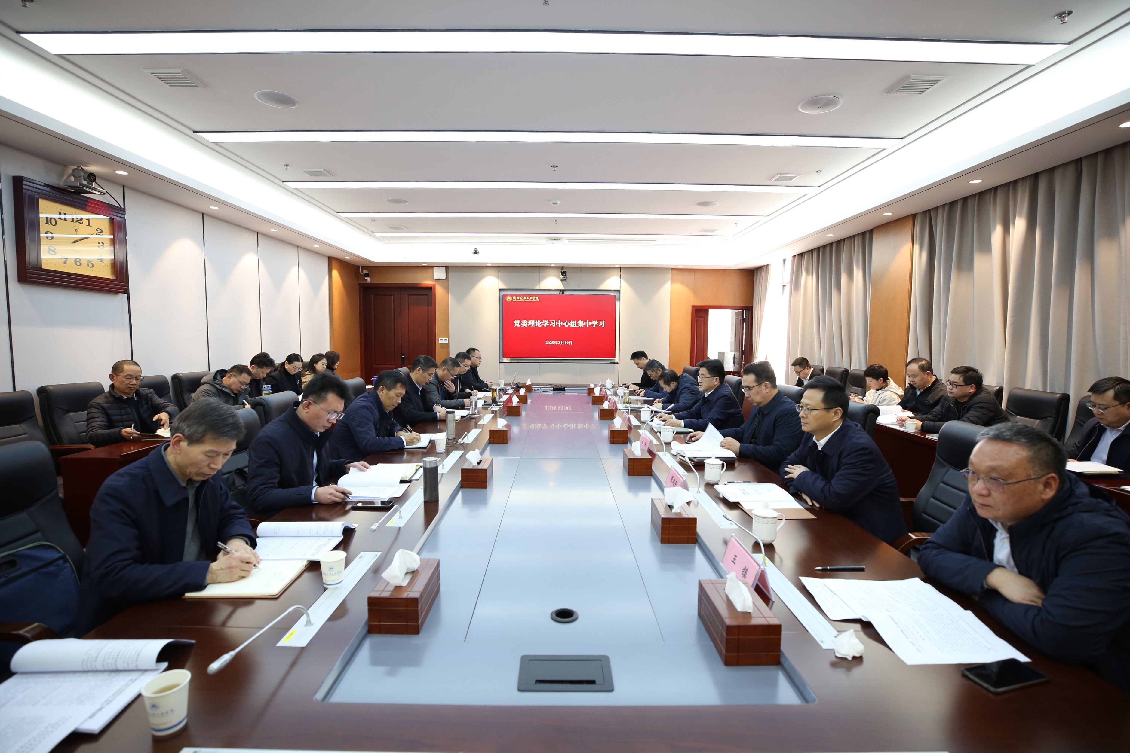 本网讯(文 刘俊/图 李一凡)3月19日下午,学校党委理论学习中心组在产教大楼三楼多功能会议室举行2025年第三次集中学习会,专题学习研讨全国两会精神。会议由党委书记张文学主持,全体在家校领导,校党委委员、纪委委员,党群部门主要负责人、二级党组织书记等参加学习。